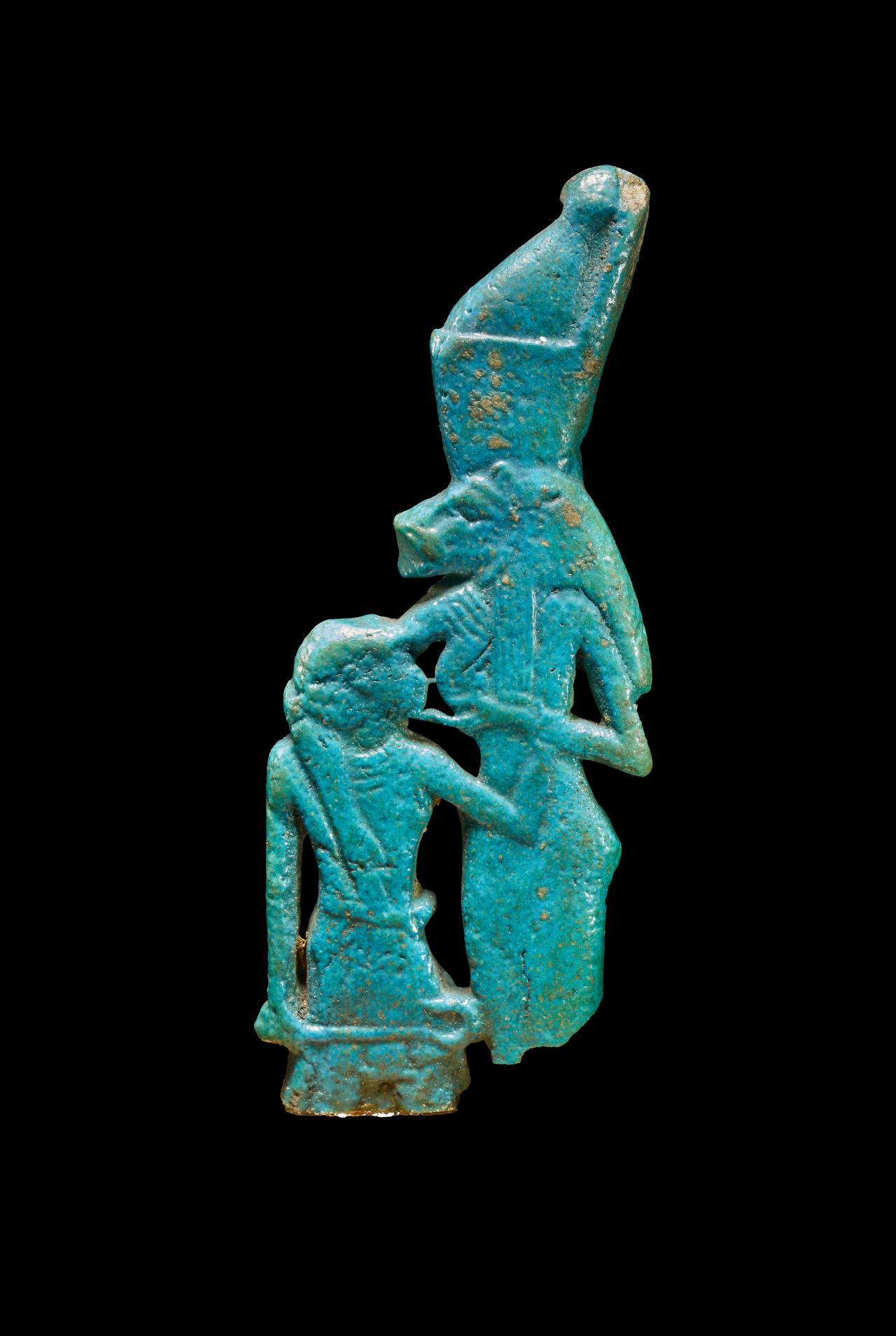 Amulet of a lion-headed goddess suckling a pharaoh