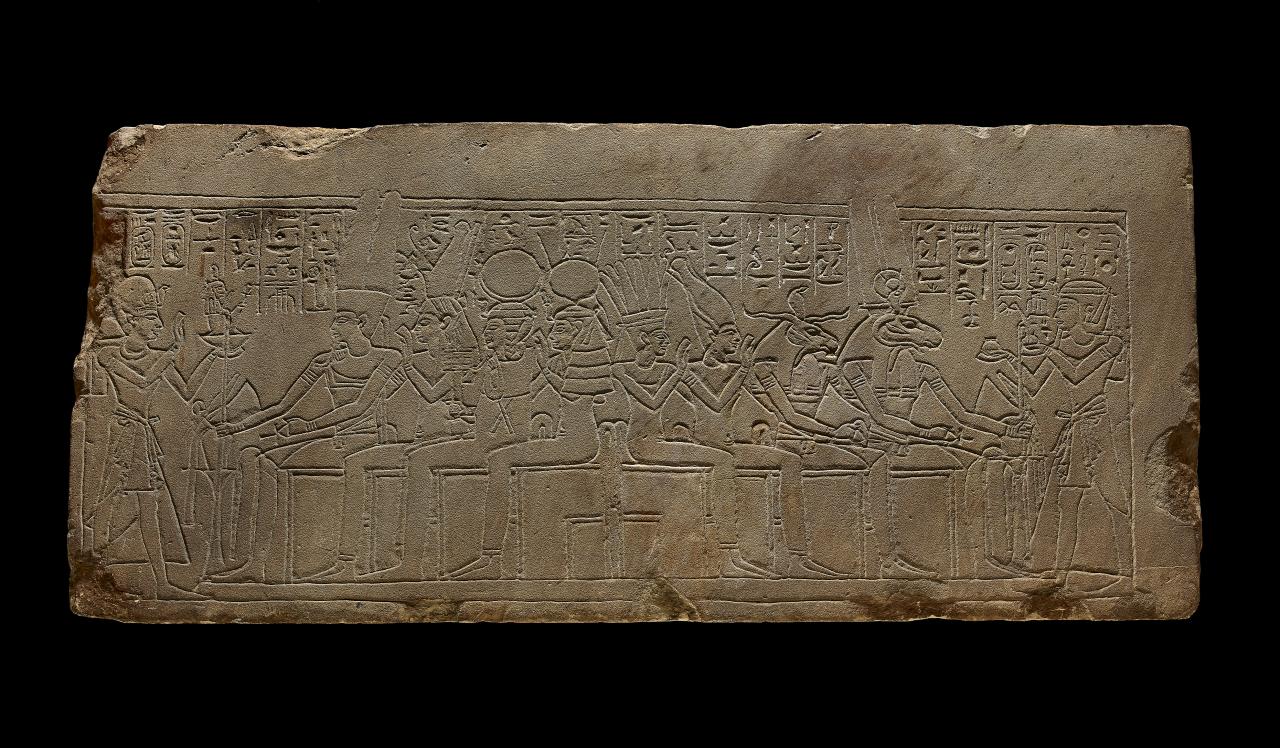 To maintain cosmic stability and balance between the human and divine world, the pharaoh was depicted in most Egyptian temples as offering small figures of the goddess Maat. On the left of this lintel, Thutmose III (about 1479–1425 BCE) presents Maat, depicted sitting on a basket with a feather on her head, to four gods – Amun-Ra, Mut, Khonsu and Hathor. On the right, Amenhotep I (about 1525–1504 BCE) offers two vases to four other gods who are associated with Egypt’s southern border.