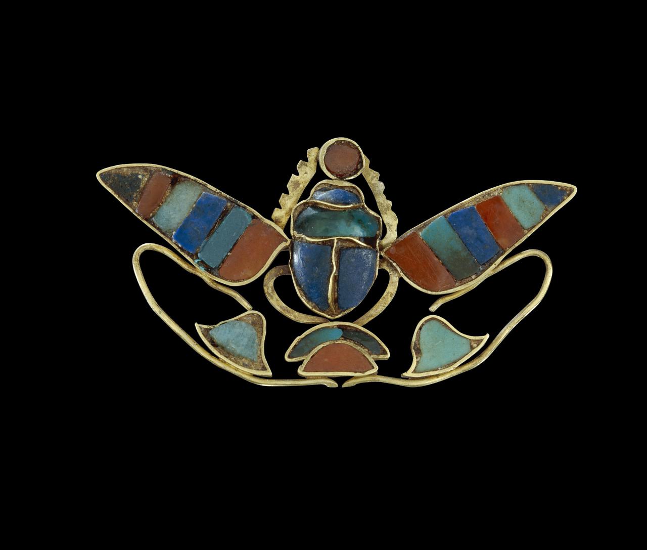 This ornament of a winged scarab pushing the sun-disc depicts Khakheperra, the throne name of Senusret II. The word kha is represented by the hill framed by the rays of the rising sun (at the bottom), kheper is represented by the scarab beetle (in the middle) and Ra by the sun (at the top). All royal names have a meaning, and Khakheperra can be translated as ‘The form of Ra is rising’. Flanking the kha (hill) hieroglyph are lotus flowers – symbols of rebirth, like the scarab – and thus the whole object is also symbolic of the Egyptian desire for eternal rejuvenation.