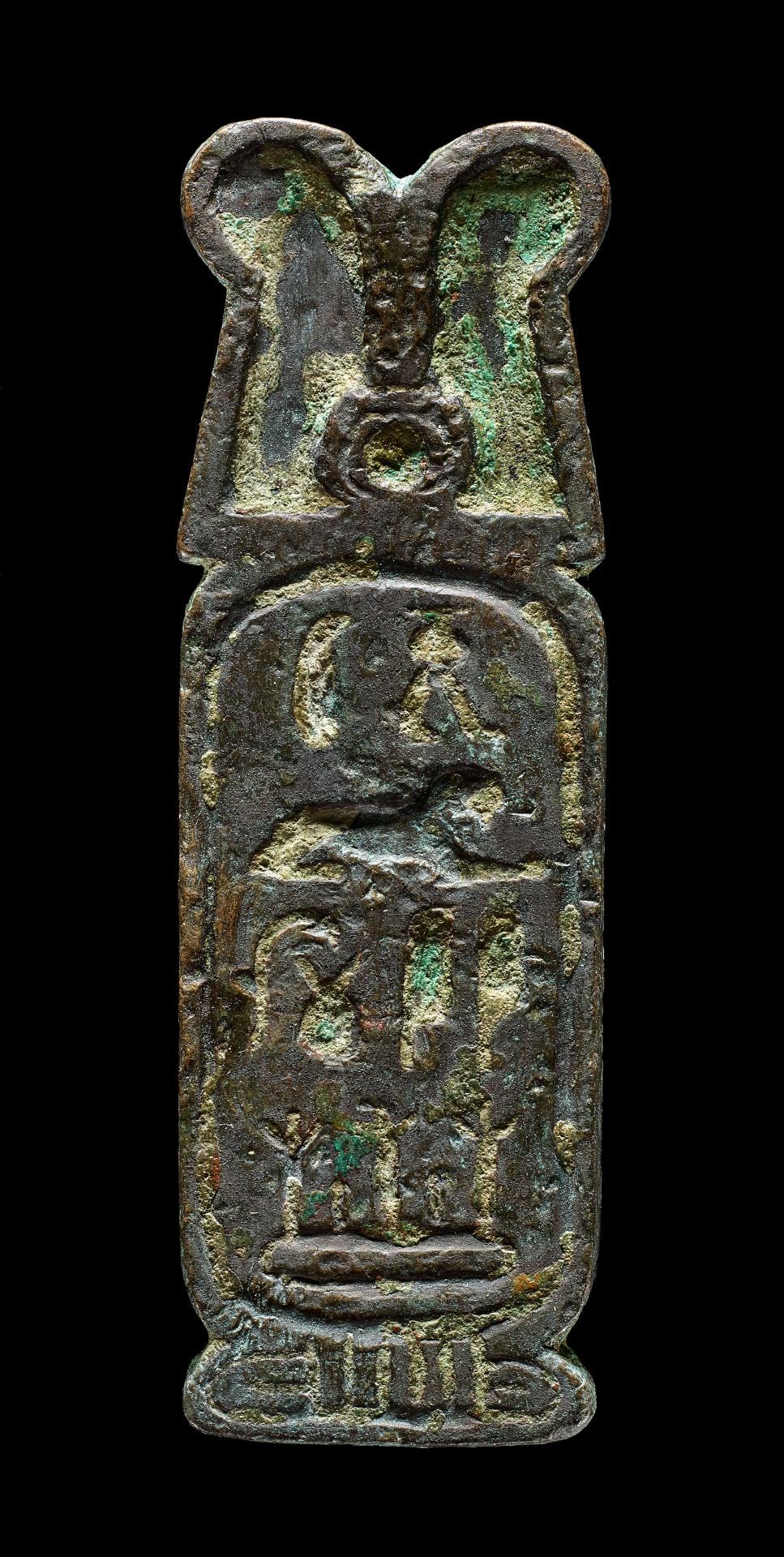 These two objects bear very similar motifs: the king’s name enclosed in a cartouche – an oval frame enclosing a royal name. The faience tile includes the fully preserved cartouche with the throne name of Ramses III. It can be read as ‘Lord of the two lands, Usermaatra, beloved of Amun’. The bronze seal surmounted by a double feather and a sun-disc shows the name of Darius I, a Persian king who ruled over an extensive empire and who, in Egypt, adopted the traditional names of the pharaoh. The hieroglyphic spelling of the name Darius, transcribed from Persian, can vary greatly.