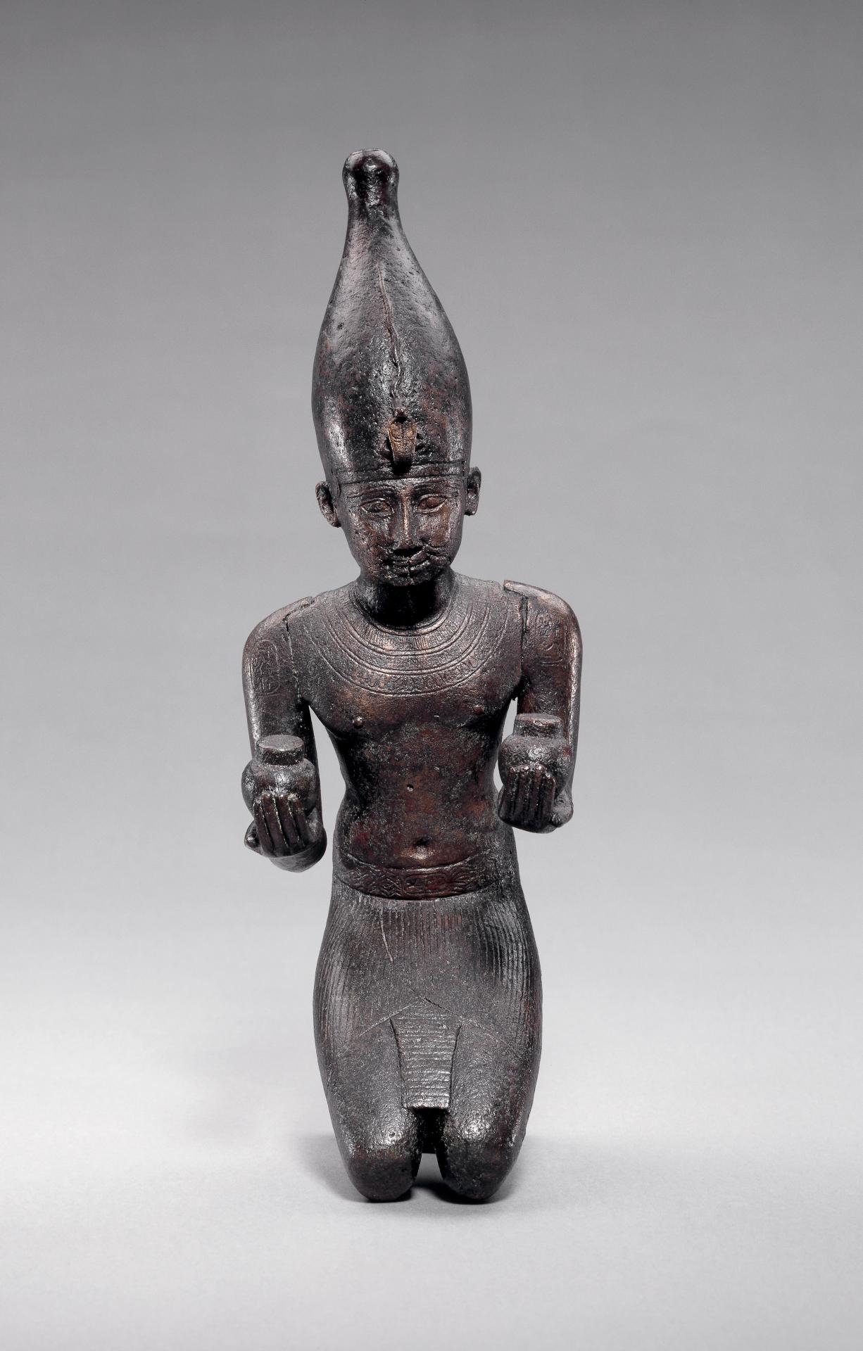 Pamy, a little-known pharaoh of the 22nd Dynasty, belonged to a family of Libyan descent. The fact that he mainly reigned over the Delta (Lower Egypt) did not prevent him from wearing the white crown, a symbol of Upper Egypt. The kneeling figure holds two pots, probably meant to contain wine or water as an offering. Perhaps they were intended for the gods Amun or Bastet, whose names are inscribed on Pamy’s shoulders.