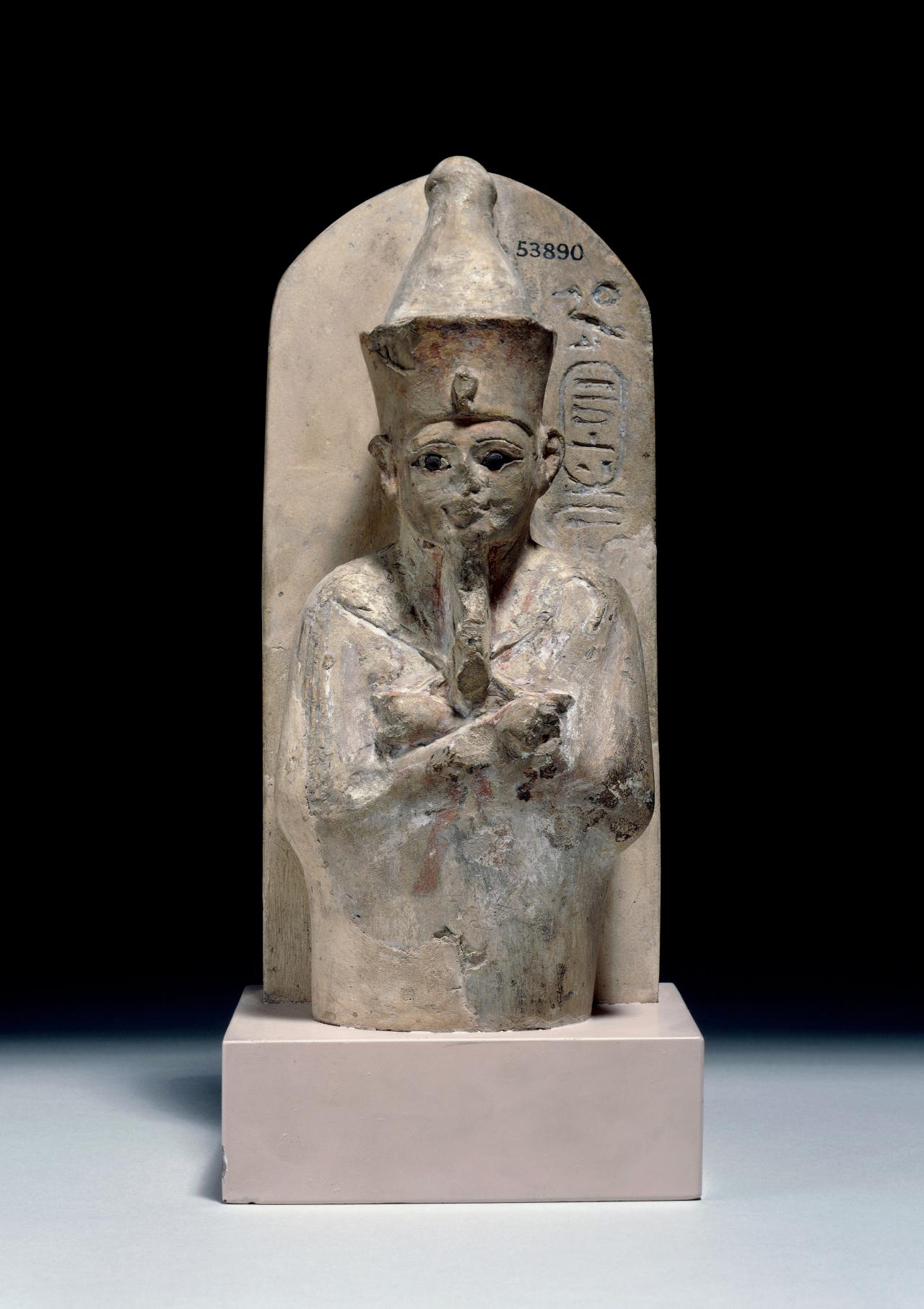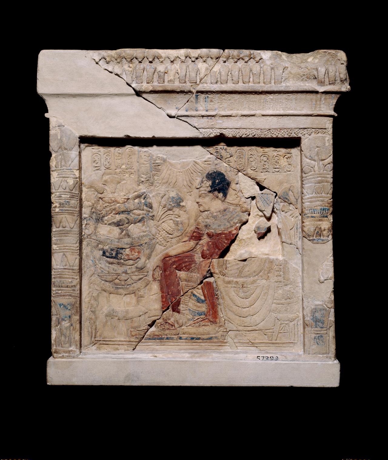 Amenhotep III (about 1390–1352 BCE) and Queen Tiy are shown in front of food and floral offerings, seated below the rays of the sun-god Aten. Amenhotep III, commemorated after his death during the reign of his son Akhenaten, wears the blue crown and other royal regalia. This stela was found in Amarna, a city founded by Akhenaten in Middle Egypt, in the house of a man called Panehsy, and it was probably placed in his family shrine.