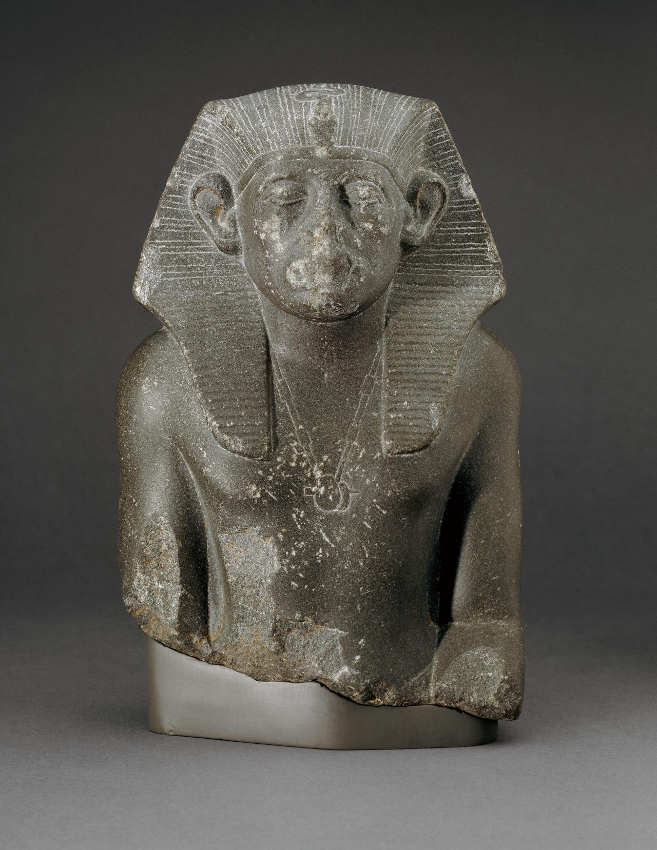 Probably originally gilded, this fragment of a statue might represent Shabaqo, a pharaoh of Kushite origin. Pharaohs from Kush (in modern Sudan) ruled Egypt for several decades, after its conquest in about 747 BCE. On top of his nemes headcloth, the pharaoh wears a double uraeus, a feature adopted by the Kushite rulers. Egyptian traditions remained an important element of Kushite culture long after they ceased to control Egypt.