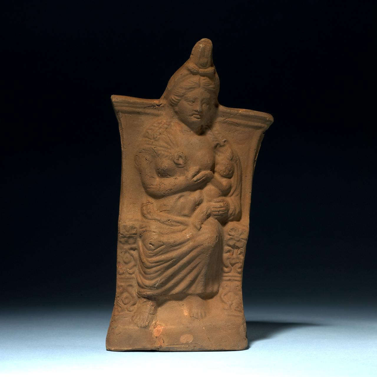 The cult of Isis as the ultimate nursing goddess spread beyond Egypt across the Roman Empire. Even within Egypt, her image was adapted and reinterpreted for the newly arrived Greek and Roman worshippers. This figure uses similar imagery to other objects displayed nearby but with new stylistic details such as the fringed shawl draping the goddess.