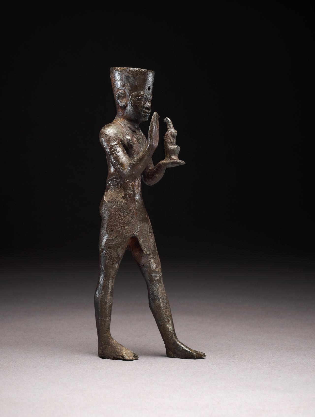 According to Egyptian mythology, the gods ruled Egypt before the pharaohs. Horus, the last divine ruler on earth, was the son of Osiris and Isis. When Osiris was murdered by his brother Seth, he became lord of the underworld. Seth then attempted to kill his nephew Horus to take the power over Egypt for himself. The figure shows Horus as an infant, fed and protected by his mother, the goddess Isis. On the intricate openwork of the spacer-bead, Isis and Horus are shown hiding from Seth in the marshes of the Nile Delta.