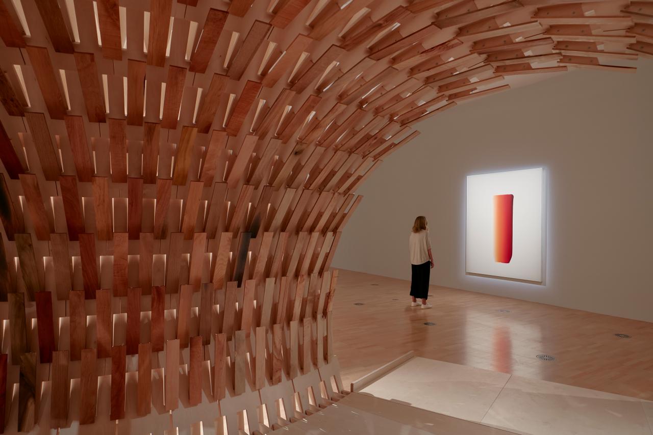 Lee Ufan emerged as one of the leading figures of the Japanese avant-garde group Mono-ha, in the late 1960s. Emphasising the relationships between space, perception, and object, his works develop from an appreciation of nature and the inherent qualities of his materials. Here, the action of repetitive minimal marks denotes an association between the body and temporality. Combining artistic practice with philosophical writing, Lee’s oeuvre is characterised by thoughtful and direct iterations of gestures, engaging the viewer in contemplation of abstract forms and vivid restraint. The work in the NGV Triennial is emblematic of this approach, part of a body of paintings created between 2016 and 2018, each entitled Dialogue. The work comprises minimal marks on a white canvas, combining to form the image of a single multi-coloured brushstroke. For the artist the work is not the object itself but the space it creates.
