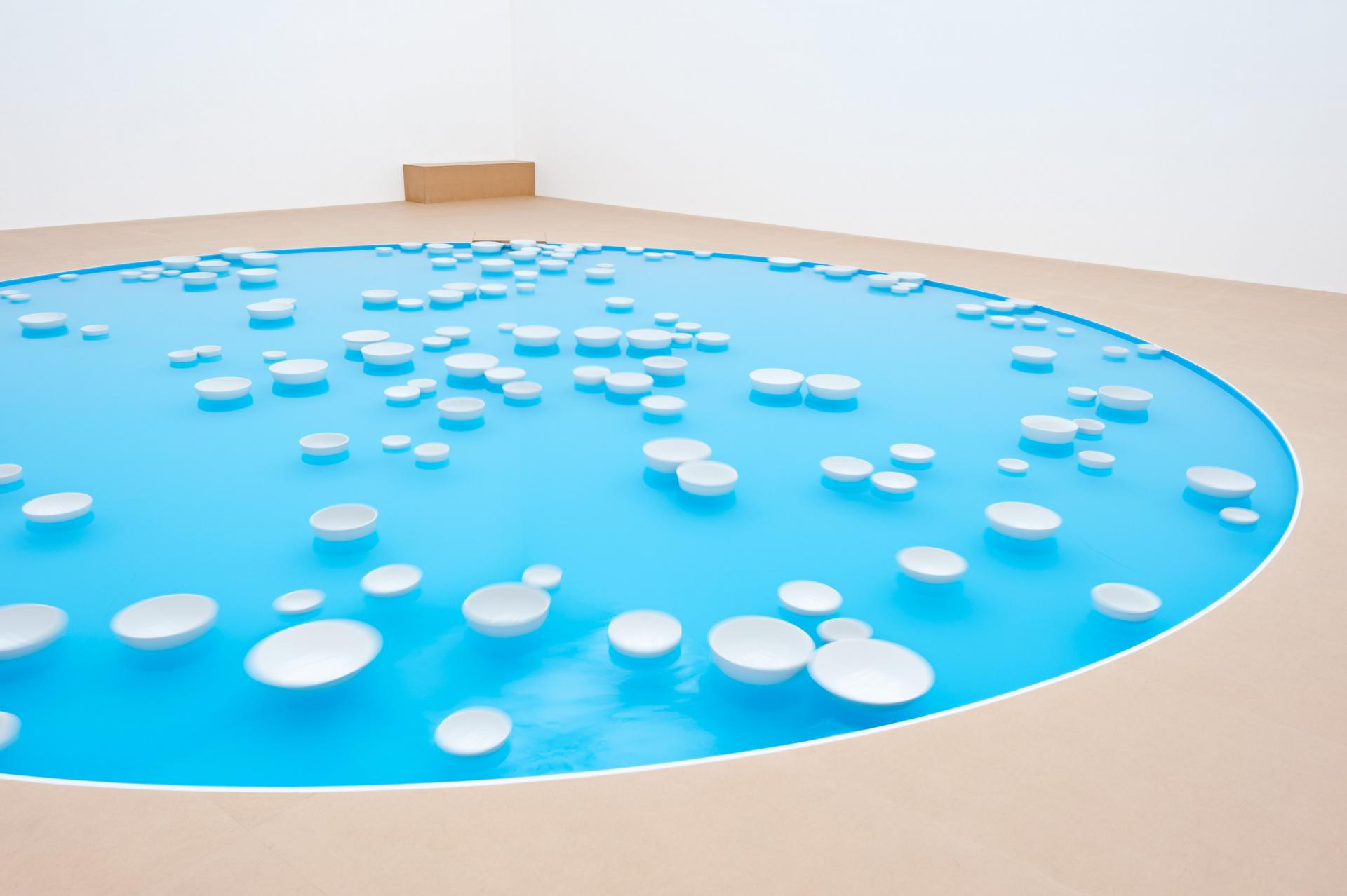 In Céleste Boursier-Mougenot’s clinamen 2013, white porcelain bowls float on the surface of an expansive, intensely blue pool. The floating crockery, swept along by submarine currents, circulates gently, colliding as percussive instruments. This constantly changing and chiming acoustic soundscape, illustrated by shifting patterns, shadows and chance compositions will resonate through the space.