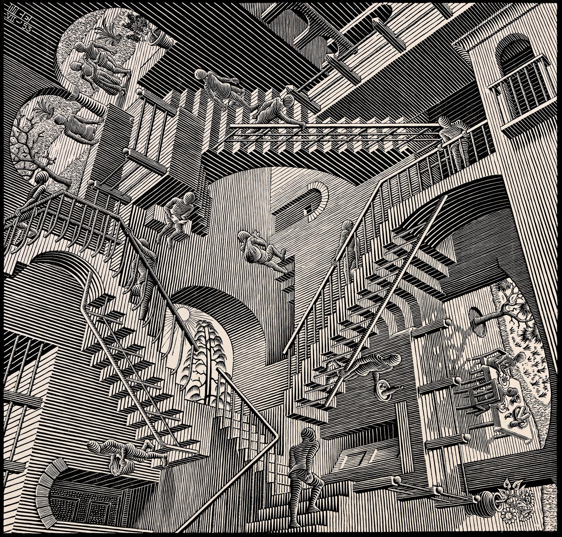 Acknowledged as a master of optical illusion, Escher created some of the most iconic images of the twentieth century which intrigue viewers with their visual puzzles and challenge established notions around space, time and the everyday world. Escher’s work depicts impossible architectural structures, endless staircases and seamless transformations of form and pattern. His fantastical constructions and repetitive infinity patterns reveal a technical and inventive genius that in recent years has become increasingly revered and celebrated.