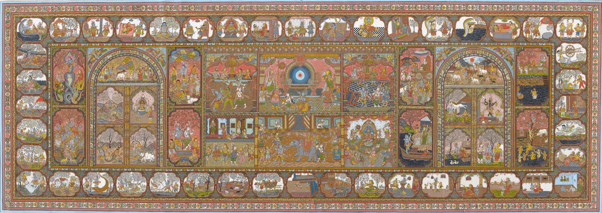 Highlights include a Buddhist narrative scroll depicting the Vessantara Jataka (Pha yao Phra Wet) from Thailand. Over 30 metres long, it is one of only two in Australia and will be displayed in its entirety for the first time. Also on display is an Indian narrative cloth banner (phad) depicting the legend of Pabuji, a deified Rajasthan folk hero, in exceptional detail and vibrant colour. The cloth is considered a dwelling of the god and forms the backdrop for a bhopa (storyteller and priest) and bhopi (the priest’s wife) to narrate and sing the legend of Pabuji to a village audience throughout a single night.