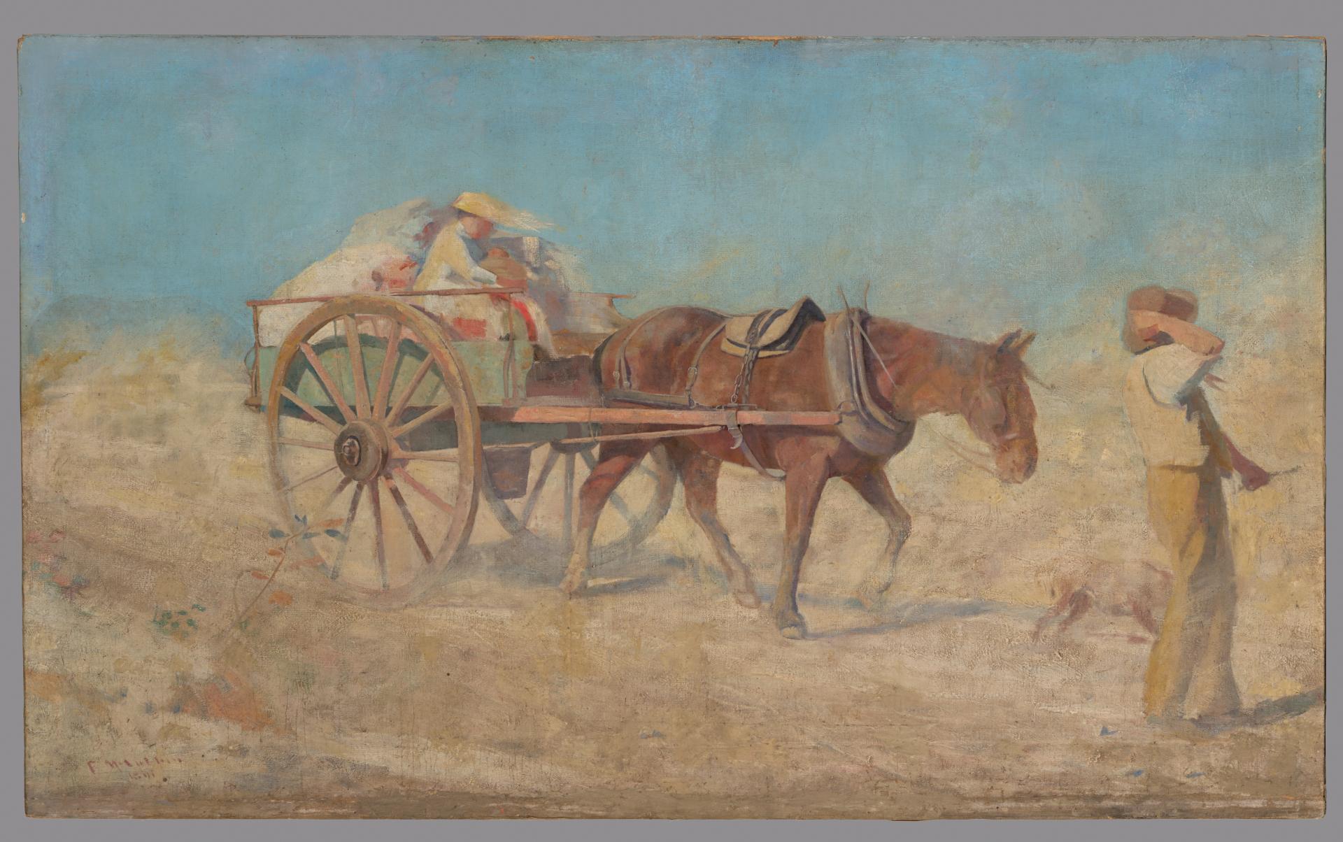 Frederick McCubbin was born in Melbourne in 1855 and developed a fondness for drawing at an early age. He studied at the National Gallery’s School of Painting from 1877 with Tom Roberts, winning a number of student prizes. In 1885 McCubbin and Roberts led plein-air painting expeditions to Box Hill, Mentone and later, Heidelberg – rural areas close to Melbourne – giving birth to a distinctive school of Australian landscape painting, sometimes known as the ‘Heidelberg School’. The North wind is an iconic work from this period and reflects McCubbin’s widely-revered imagery of everyday people at work and rest, capturing the spirit of the Australian bush.