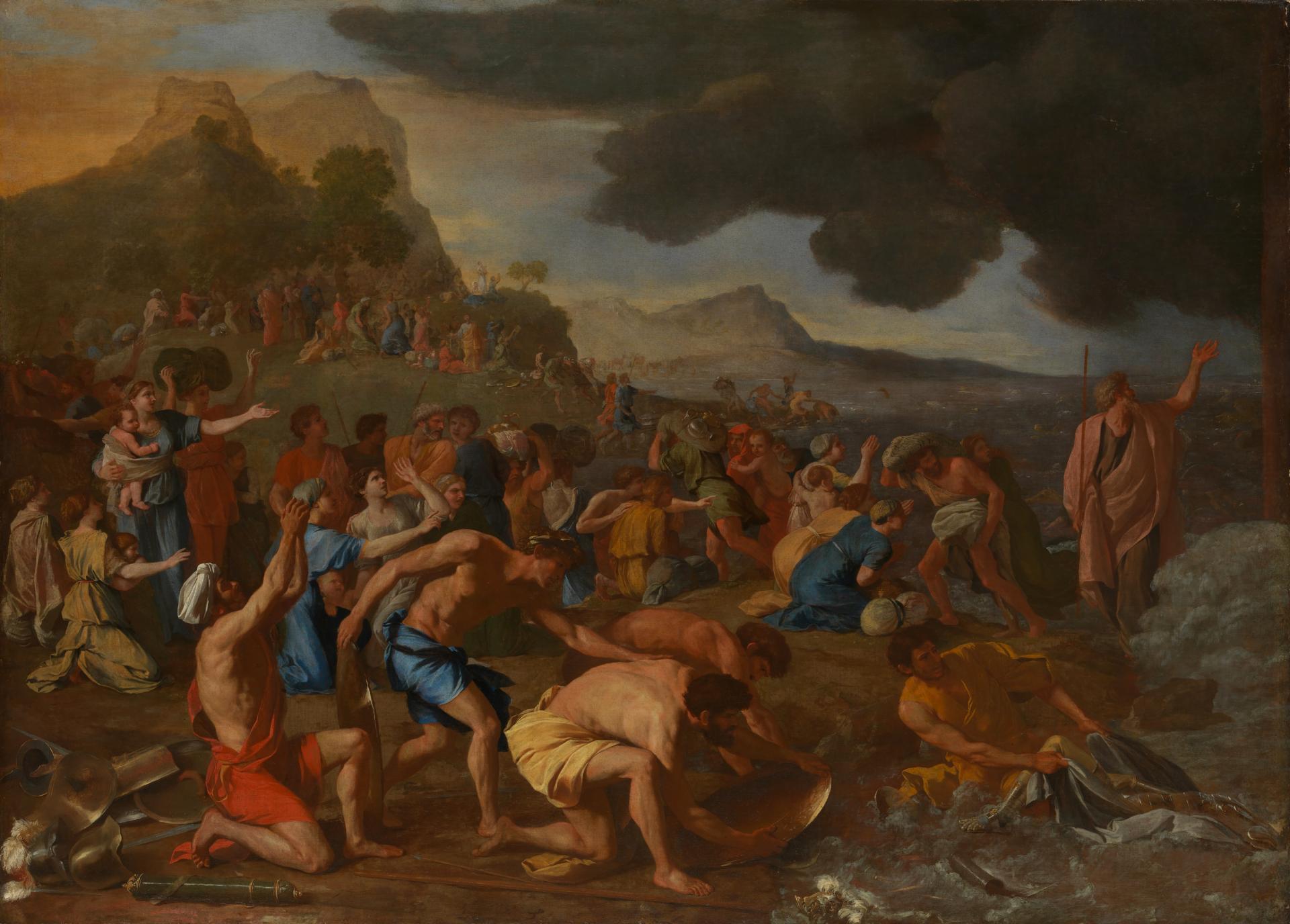 Poussin is recognised as one of the greatest French painters of the 17th Century, known for his dramatic and emotional story-telling expressed through grand gesture and pose. The Crossing of the Red Sea displays Poussin’s unique balance of colour and composition. The painting depicts an episode from the Old Testament Book of Exodus, where Moses performs the miracle of parting the Red Sea, allowing the Israelites to escape the pursuing Egyptians, who subsequently drown.