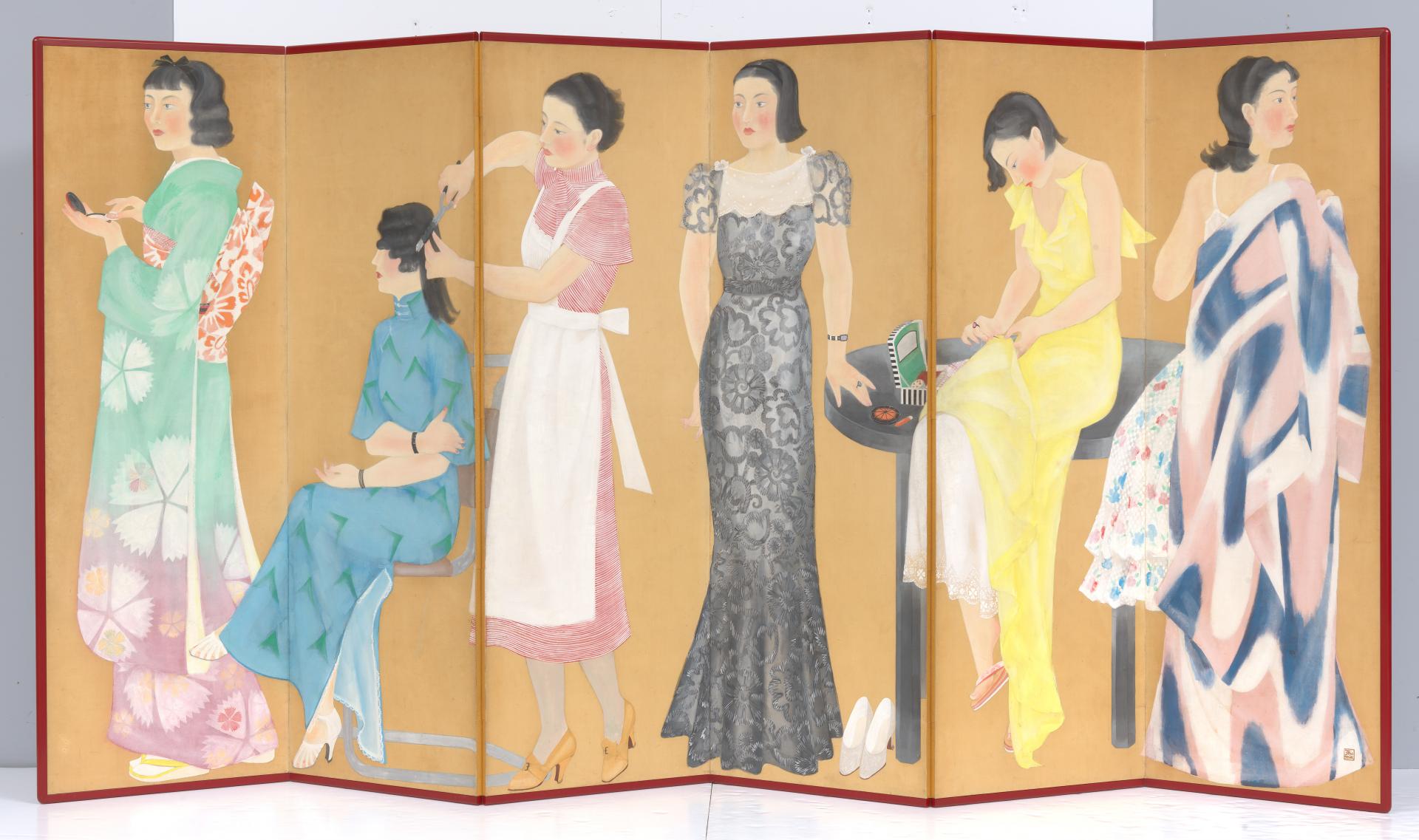 In 1935, Japanese artist Taniguchi Fumie created her trailblazing work Preparing to go out (Yosoou hitobito). Taking inspiration from the 17th century Matsuura screens, the artist created a large sixfold screen capturing changing attitudes towards women, consumerism and fashion in the early 20th century. Despite making huge progress in her artistic practice during the 1930s, Fumie had her burgeoning career cut short after she evacuated to the countryside to escape the final bombing raids of World War II. Leaving Japan in the early 1950s, Fumie was never known to paint again and eventually settled in Los Angeles, where she found work as a waitress, seamstress and maid.