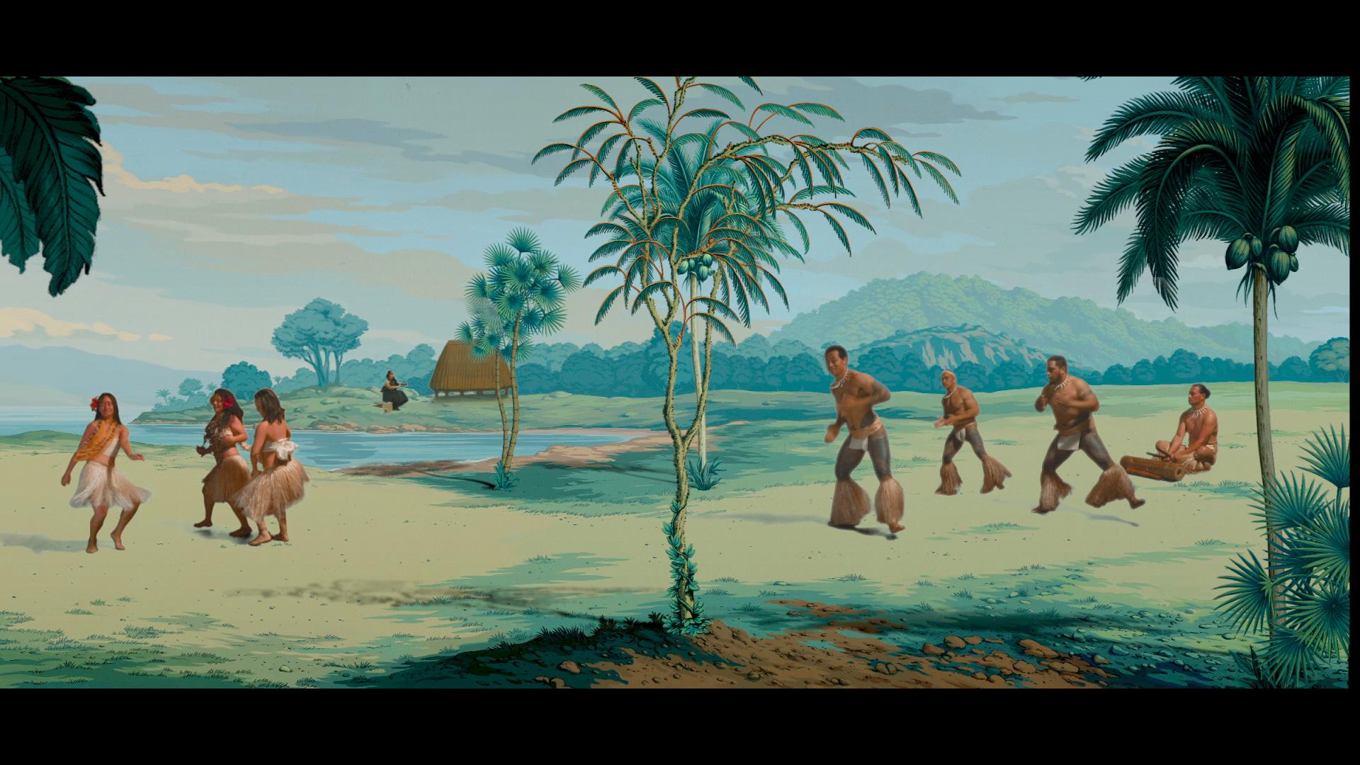 Reihana subverts the fanciful representation of Pacific Islander peoples found in Les Sauvages by populating her video work with the sounds and actions of accurately dressed Māori and Pacific Islander actors and boldly illustrating moments of violent imperial conflict, events which are noticeably absent from Dufour’s idyllic panorama.