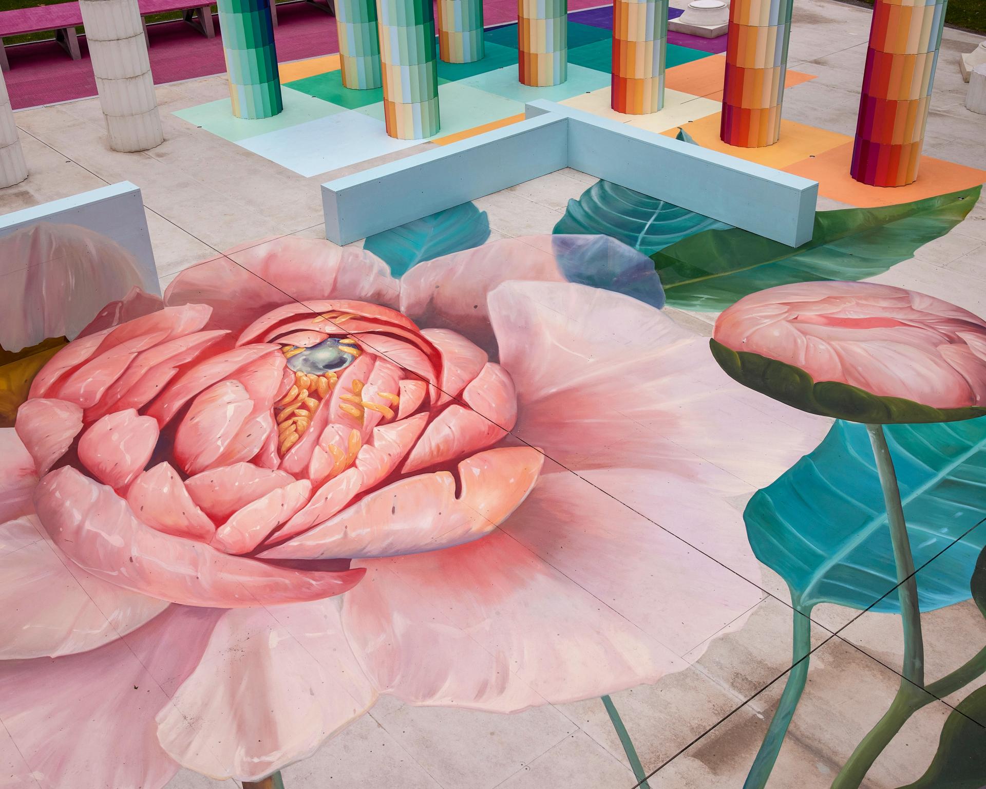 Ranging from vibrantly coloured floral motifs to optical illusions, the artworks draw inspiration from the colourful and artistic embellishments that covered the original building over two-thousand years ago.