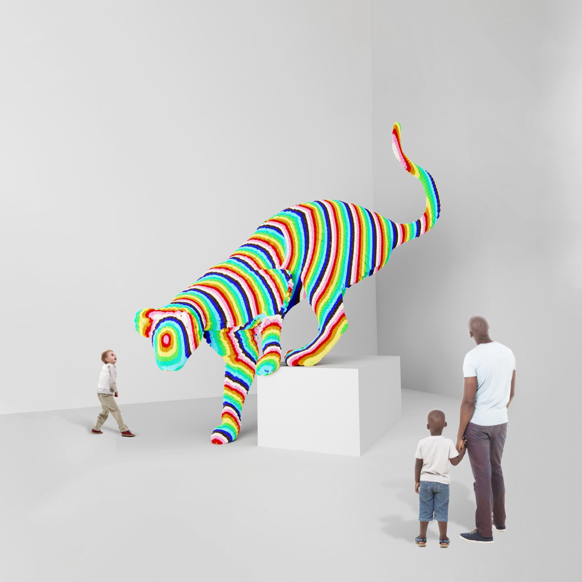 Also on display is Troy Emery’s largest sculptural and most ambitious work to date, standing over three metres high. In this textile-based work, bright-coloured pom-poms are assembled and pinned over an underlying form to create a large-scale feline sculpture. The work explores humankind’s relationship with animals and their historical representations in museums and in taxidermied form.
