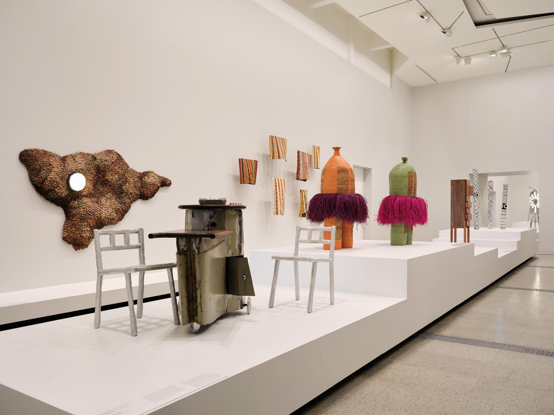 The winner of the $40,000 prize, Australia’s most prestigious accolade for contemporary design, is Adelaide based Aranda artist, Alfred Lowe. His ambitious ceramic vessels, You and me, us never part, 2025, were unanimously selected by the Prize Jury. The work comprises two large-scale figurative ceramics combining rigid and roughly textured clay with soft raffia adornments, exploring beauty, community and Country. The ceramics stand side by side, each over one metre tall, and speak to the contradictions of love and hate, pain and joy through the friction of these materials.