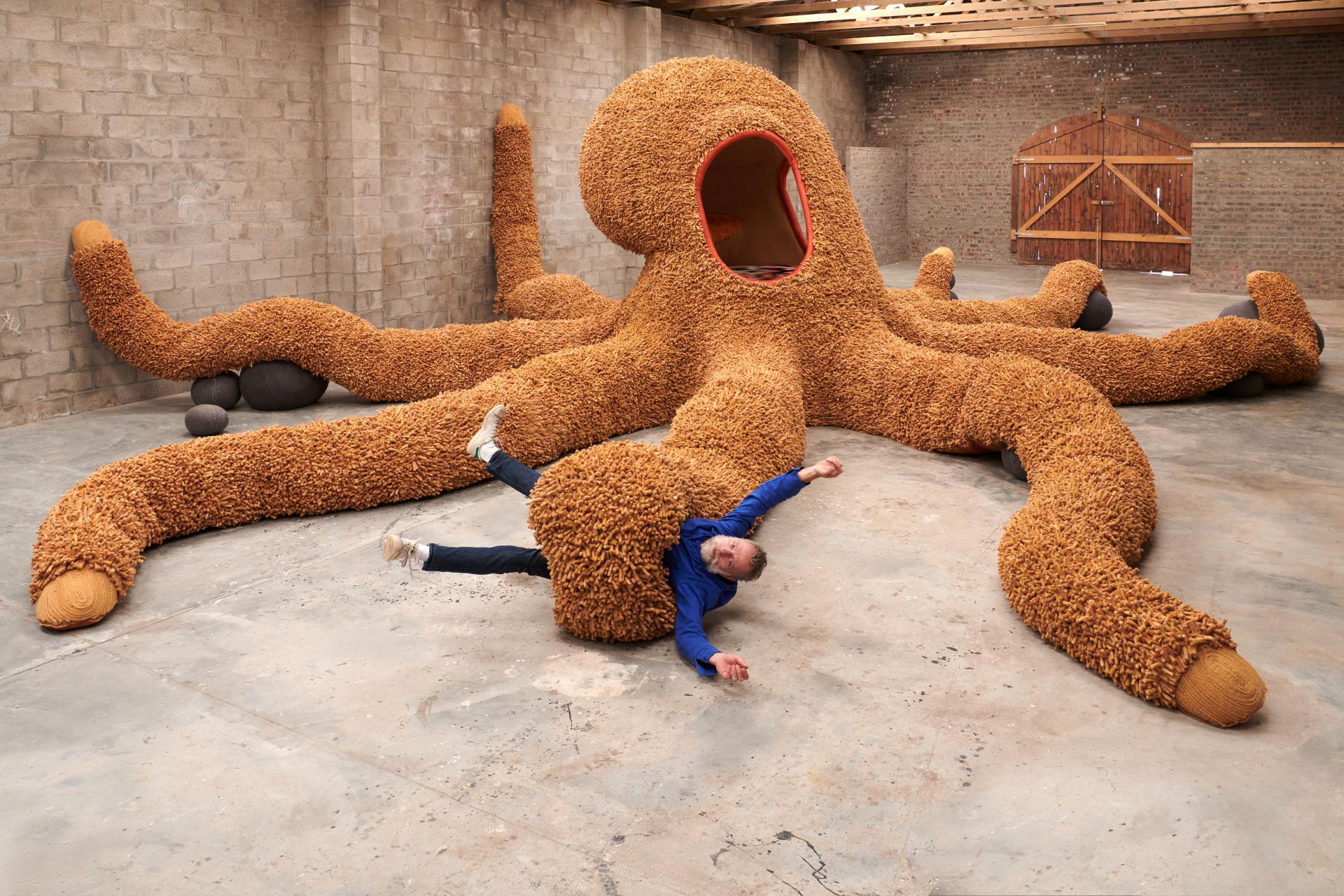 - Porky Hefer (b. South Africa): This major new work consists of a series of large-scale handmade environments populated with imaginary sea creatures from a dystopian future that the artist describes as “the Plastocene”. The collection, including a 14 metre-wide octopus constructed of giant hand-felted cigarette butts, draws attention to ocean pollution by imagining mutant sea creatures evolved from plastic bags, straws, and coffee cups.