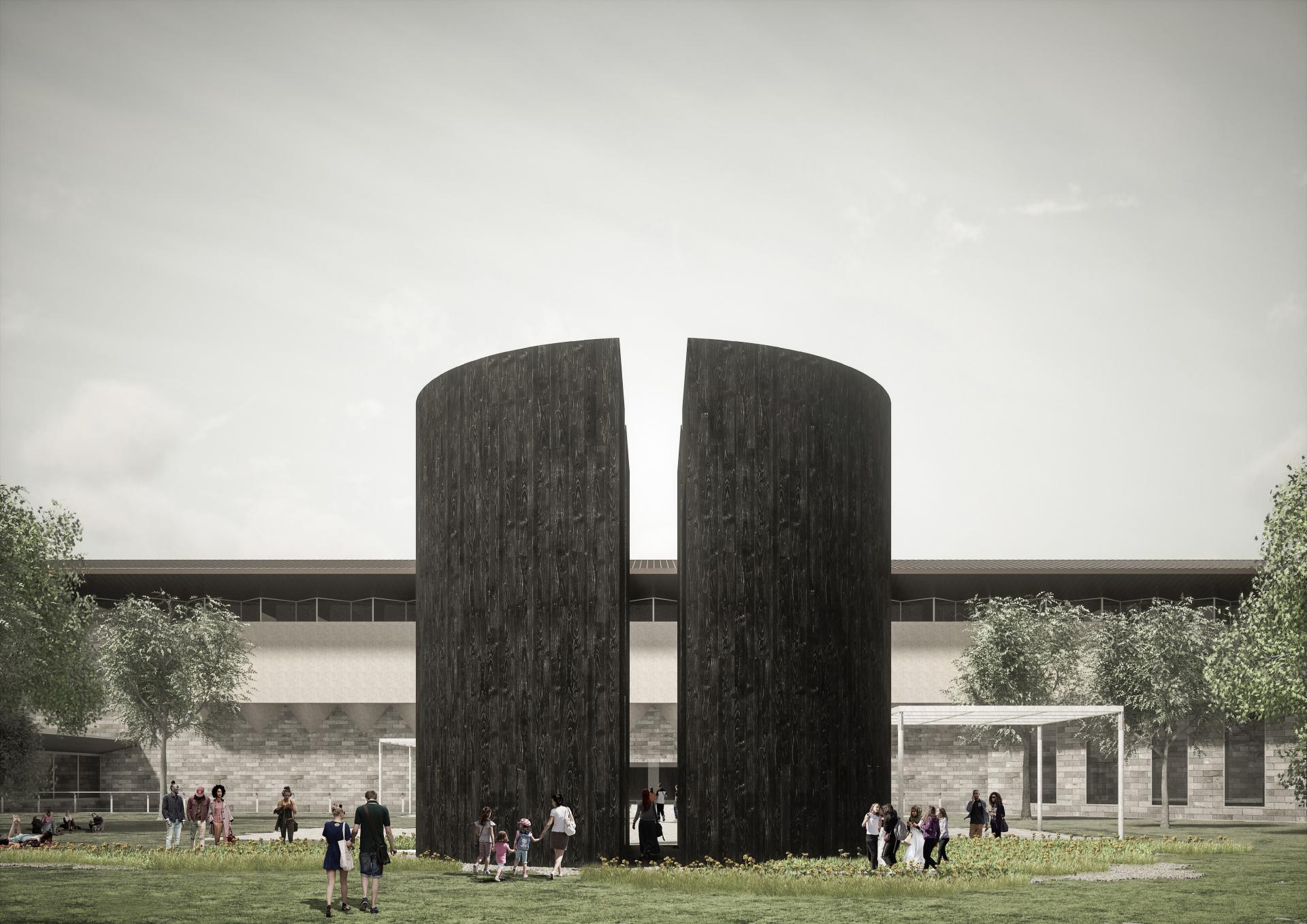 The dark and enigmatic exterior form of the timber tower conceals a textural and uplifting interior, composed of two dramatic internal voids adorned with thousands of black glass Yams by Yhonnie Scarce.