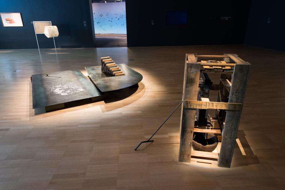 pig’s blood and wood flour, steel, paper, thread, neodymiuym, cast iron, wood