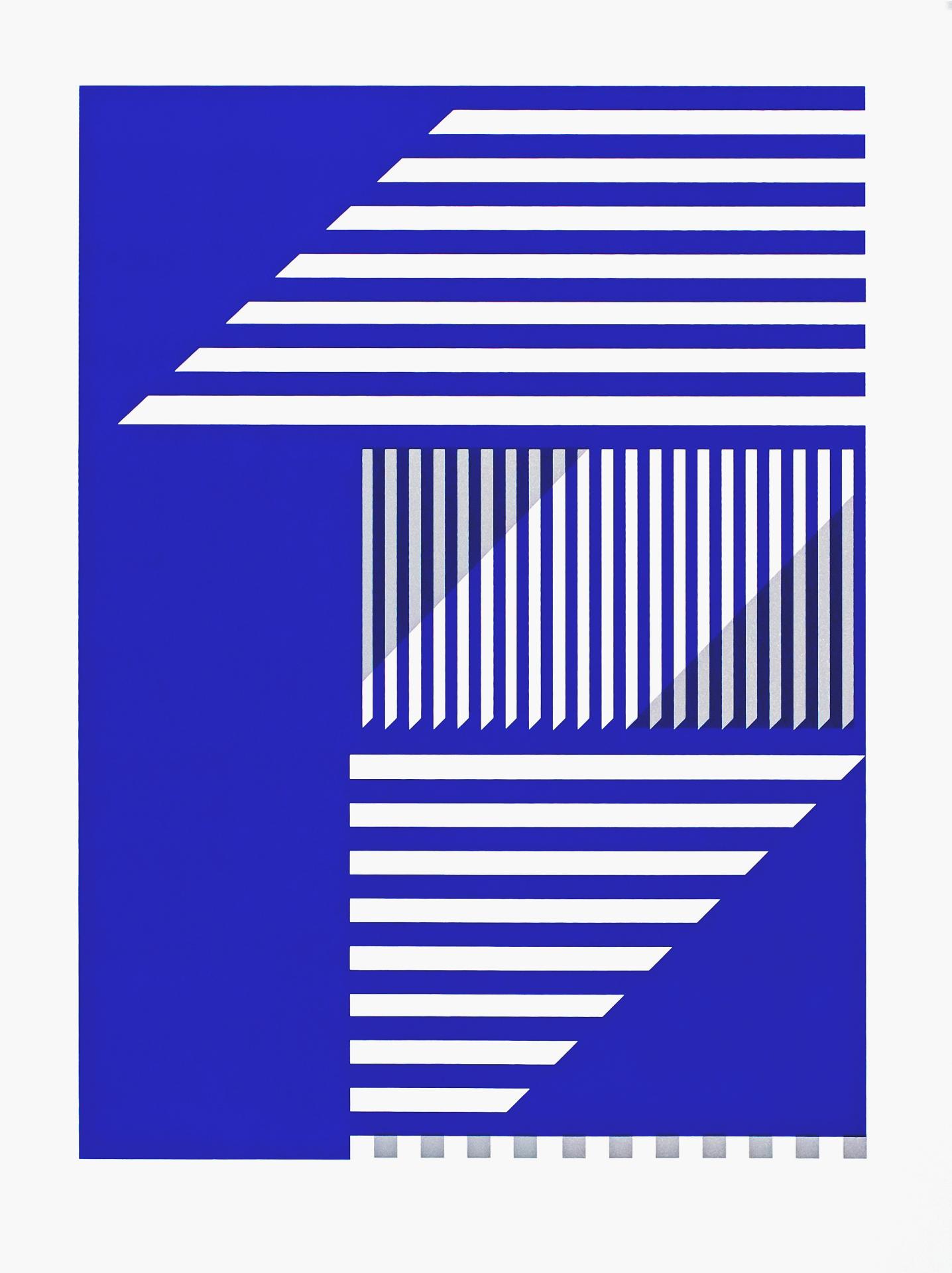 Here, Clapham turns his gaze to the urban geography of Melbourne’s west, where he prints all his work at Sunshine Print Artspace, overlaying photographic imagery with graphic shapes rendered in his trademark cobalt/cerulean blue ink. This sublime colour, often chosen to evoke sea and sky, is used to create systematic, grid-like patterns, suggesting the uneasy collision of nature and culture. Drawing upon printmaking’s legacies in both advertising and art-making, Clapham presents a subtle critique of urban construction degrading the Australian environment.