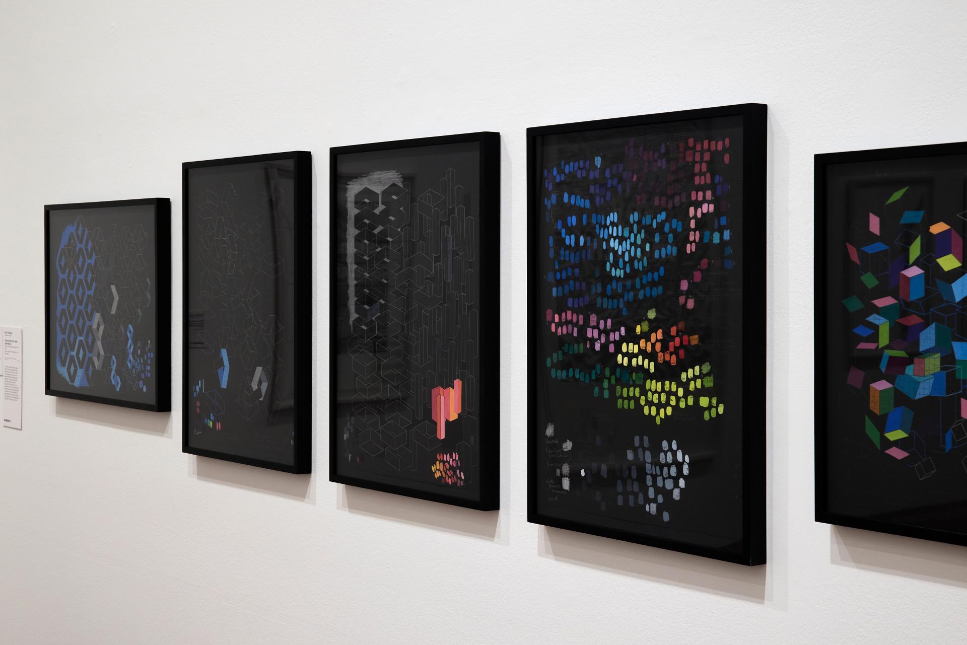 For Melbourne Now, Finlayson presents five works from her Working Drawing series, created between 2017 and 2019. Each of the works feature fine underlaid pencil-ruled grids on black paper, over which the artist has worked in colour pencil and gouache details. These grids expand and morph throughout the series, with interlocking forms and structures overlapping in a playful exploration of form. In Still life with artist’s palette (after Anne Vallayer-Coster), 2018–19, an ordered spectrum of gouache daubs is annotated with the names of colours and details of each colour’s properties, exemplifying the artist’s tendency to uplift process as a central part of the finished work. In what the artist calls ‘an observational approach to image making’, each drawing on display is inscribed with multiple dates (recalling the days on which the artist worked on the drawing) and annotations providing clues around intertextual links and historical precedents to the works, from Josef Albers’s Structural Constellation series to Bridget Riley’s optical illusions.
