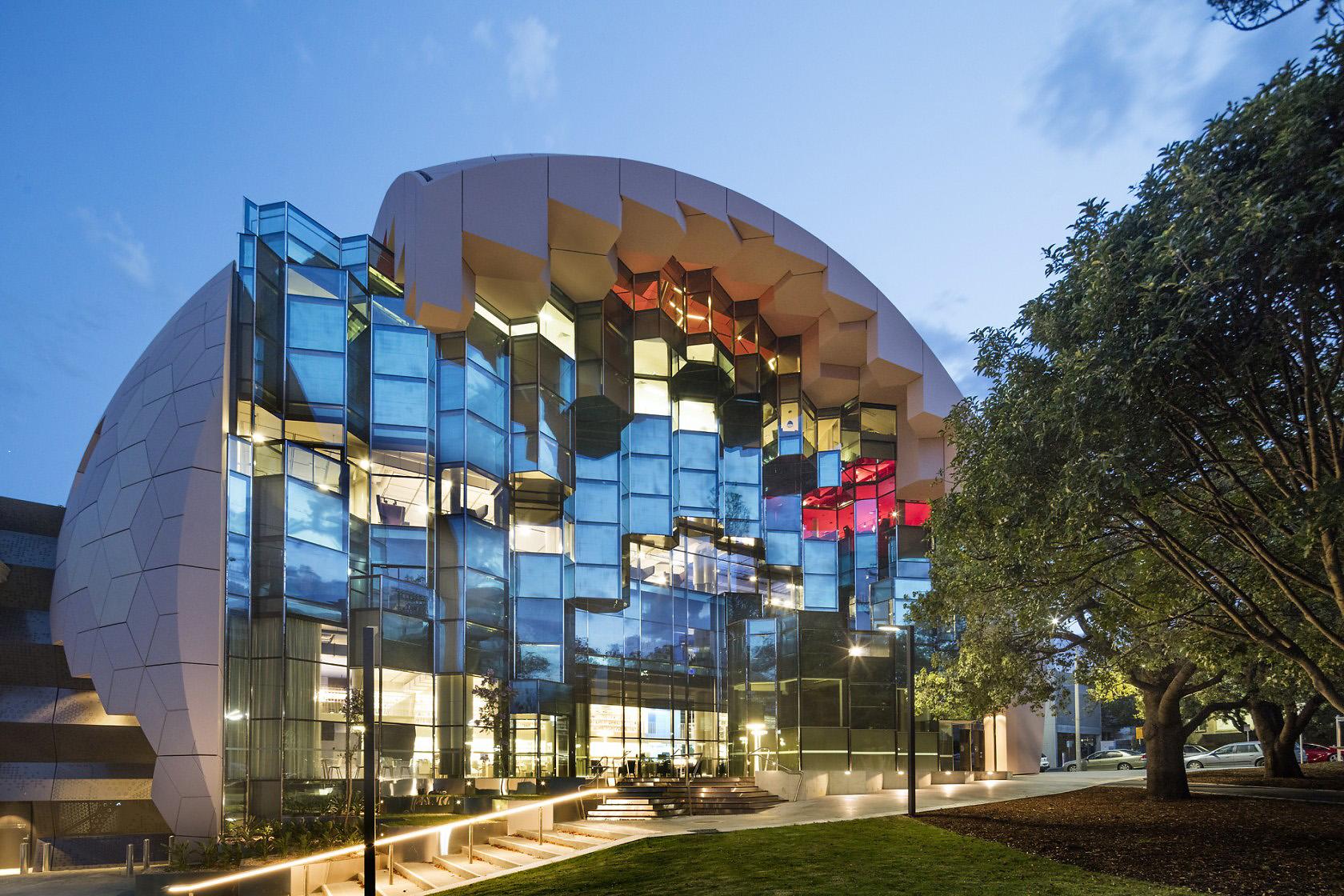 The Geelong Library and Heritage Centre (2013–15) houses the central library and administration of the Geelong Regional Library Corporation, including the Geelong Heritage Centre. Located adjacent to Johnston Park, the building is interpreted as a pavilion in the landscape, in the shape of an eroded dome that both references and subverts the international legacy of dome-shaped libraries – locations of self-improvement, knowledge and curiosity. With its high visibility in the approach to the city centre from Mercer Street and Geelong Railway Station, the building becomes a definitive symbol of the city on Wadawurrung Country. More than seven storeys high and covering 6500 square metres, the structure comprises library facilities, offices, a gallery space (shared with the Geelong Art Gallery), state archive storage and public research facilities, as well as cafe and function spaces. The project cost $45 million and was officially opened to the public in 2016, receiving over 85,000 visits in its first two months of operation.