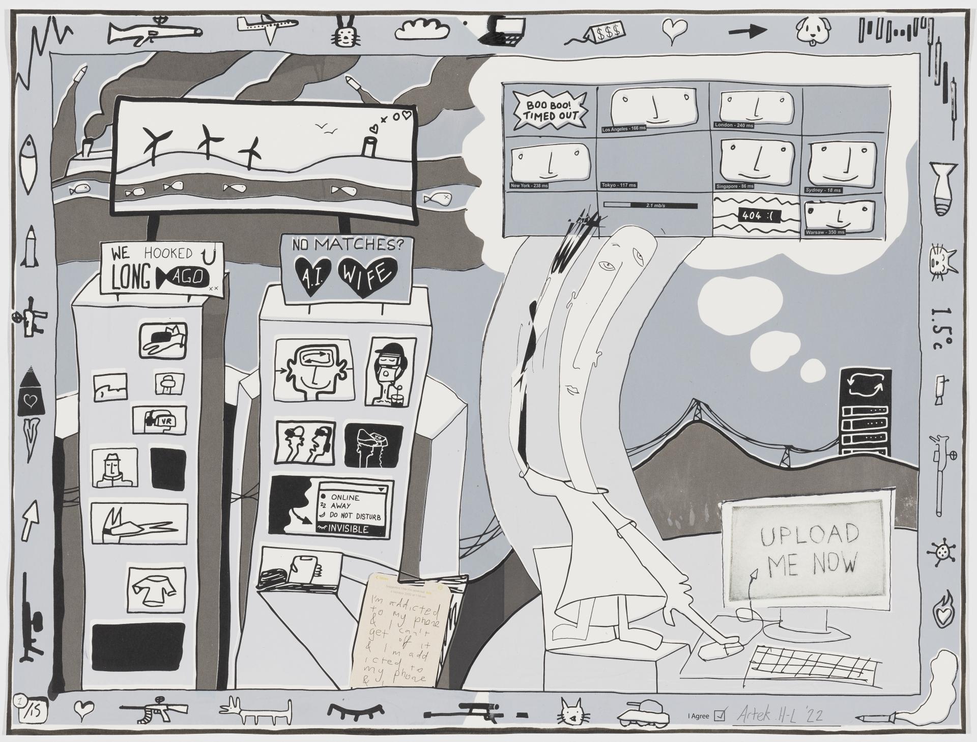 For the vv, Halpern-Laurence has created a multicolour screenprint responding to visions of the ‘Metaverse’ and ‘Web3’ currently being peddled by Facebook, which founder Mark Zuckerberg described as ‘an embodied internet where you’re in the experience, not just looking at it’. The piece was inspired by a quote lifted from a Meta keynote, where the presenter declared that ‘we are already living in the Metaverse’. To overcome our ‘clunky and rudimentary’ interactions with this hybrid physical-and-digital reality, the company proposed using VR headsets. Halpern-Laurence gently satirises the techno-utopianism of Silicon Valley, whose bold claims regarding new technologies either misrepresent pressing real-world concerns, such as climate change and human inequality, or ignore them entirely. His playful take on the monthly calendar turns our days into a game of snakes and ladders, including reminders to ‘Breathe! Connect to nature! Work! Walk the dog!’, parodying the platitudes spouted by productivity culture.