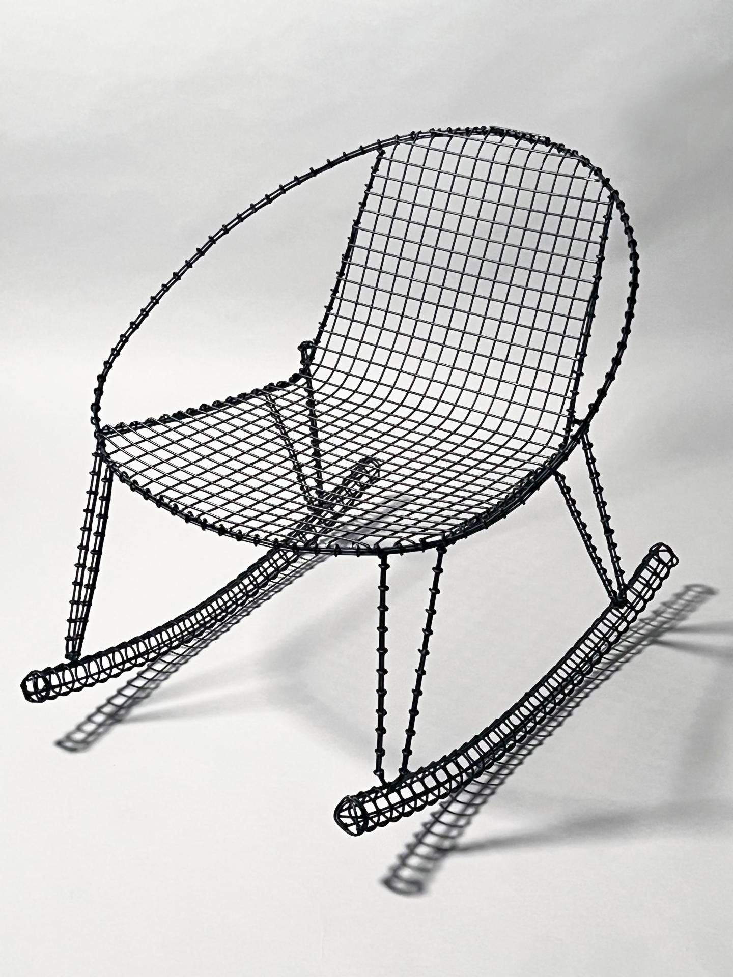 Deep rocker, 2022, comes from Allen’s series Caged, which reinterpreted iconic furniture designs in industrial materials. First exhibited at Kew’s Villa Alba as part of Melbourne Design Week in 2022, the series comments on design ‘knock-offs’ and copyright protection.