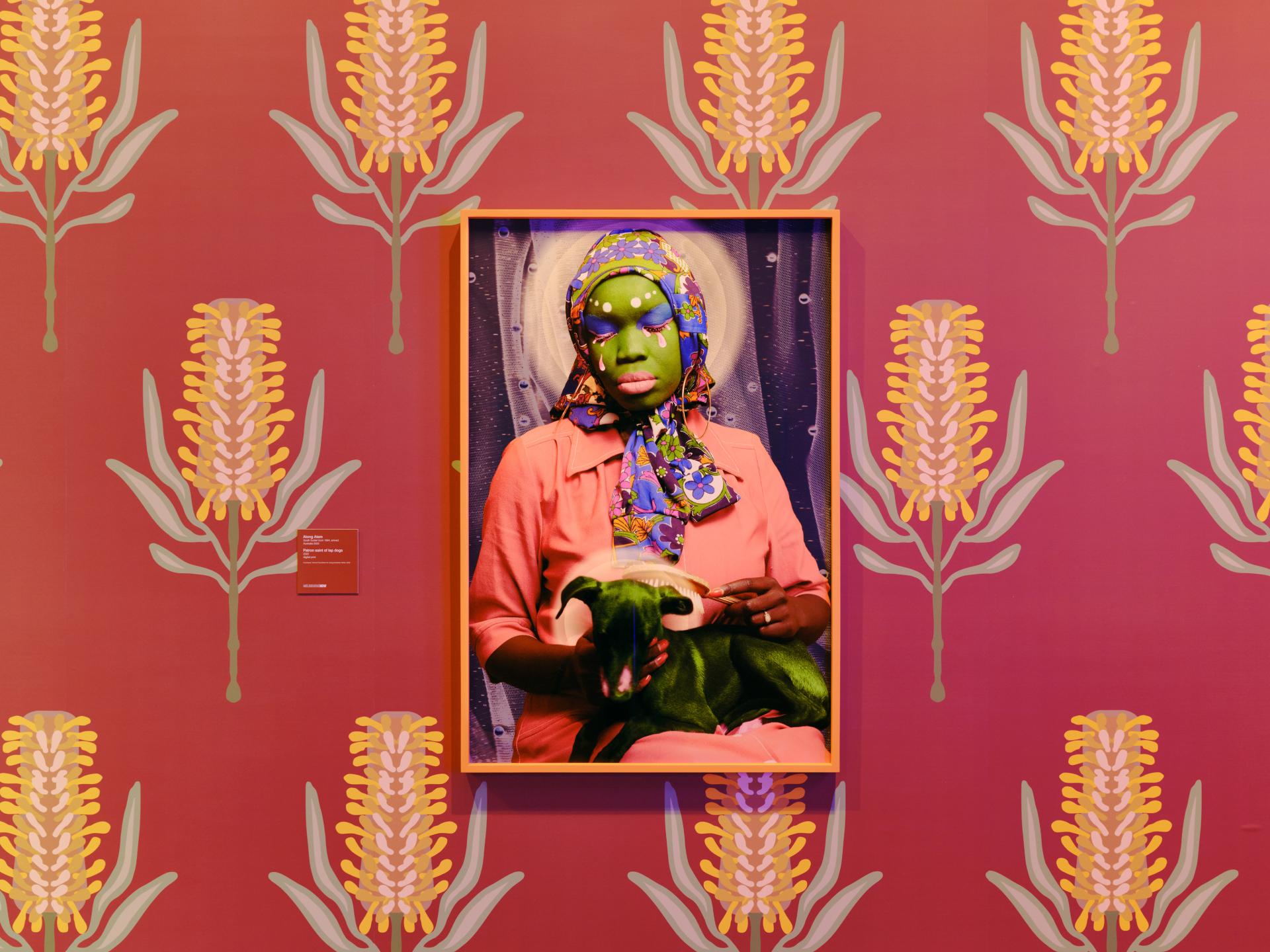 For Melbourne Now, Atem premieres three new photographic self-portraits. Composed in the vibrant, staged yet intimate style she has become known for, Atem’s portraits draw – and build – on the history of studio photography in Africa, in particular the work of renowned Malian photographers Malick Sidibé and Seydou Keïta. In Patron saint of lap dogs, 2022, and Maria of Mars, 2022, radiant circles of light frame the artist’s face (and that of her canine companion) against intricate, textural backdrops. In Red dust sticks to you, 2022, a brick-coloured backdrop and make-up recall the hues of the Australian outback. Also featured in Melbourne Now are two of Atem’s neon works from 2021, both referencing native Australian flora in an unquestionably urban medium.