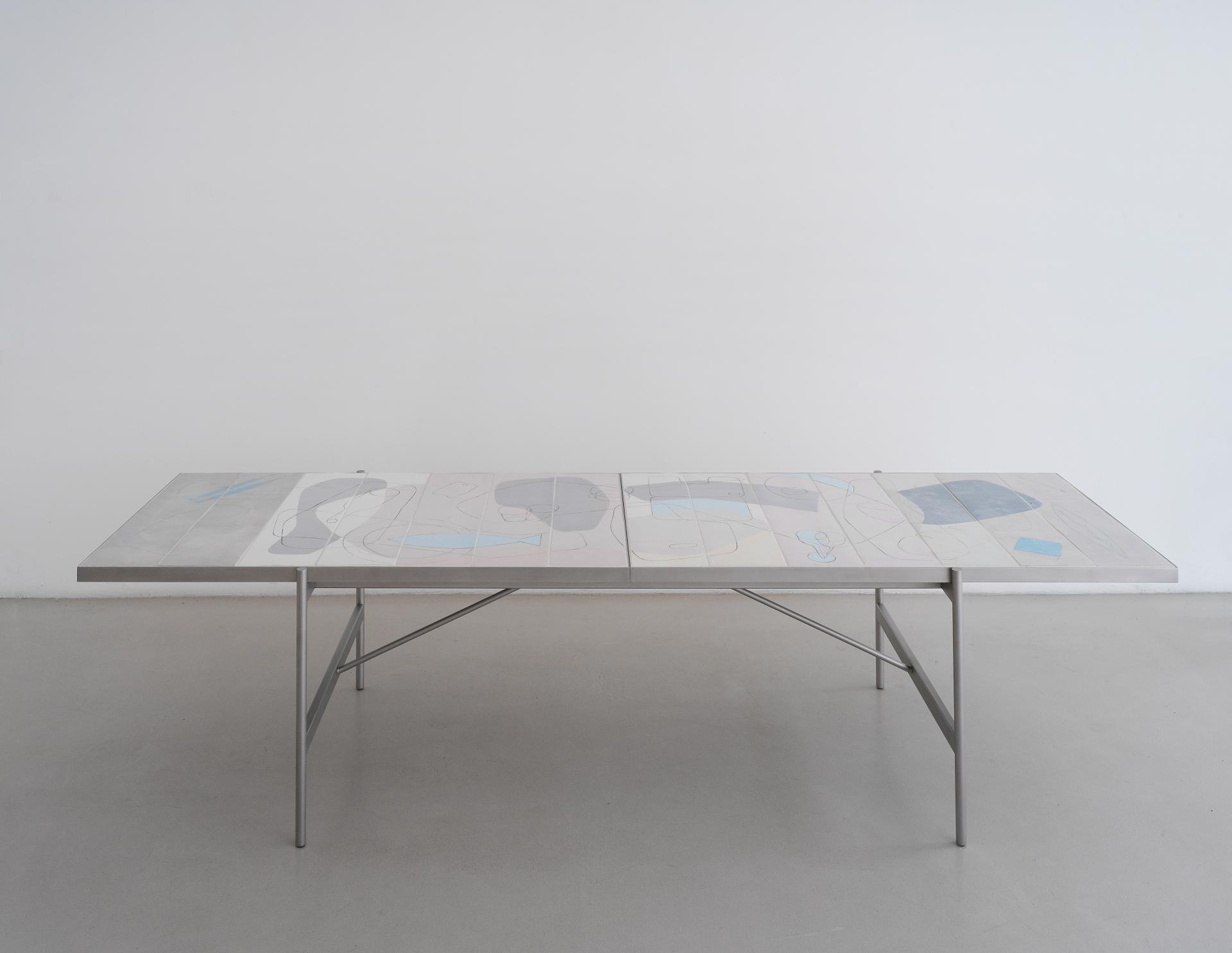 Connell’s table Altar, designed in 2021 and manufactured in 2022, was created in response to Melbourne’s COVID-19 lockdowns. When Melburnians could not leave their homes, tables were required to perform multiple functions: ‘I came to the table to eat, design, entertain, dream, discuss, cry and even pray’, explains Connell. Supported by a stainless-steel and aluminium frame, Altar’s porcelain surface is constructed with tiles that the designer painted by hand. For Connell, these symbols represent moments of seeking refuge, retreat and reflection. A loaf of bread, bottle of wine, plate of fish and bowl of fruit show the table as a site for gathering, feasting and communing with loved ones. Connell adds illustrations of the primary tools in his creative and professional practices – a mobile phone, laptop, sketchbook and pen – which during lockdowns were conducted in the same place where he ate and entertained. This everyday item of furniture is transformed into a still life that captures our search for stability and connection during a time of great uncertainty.