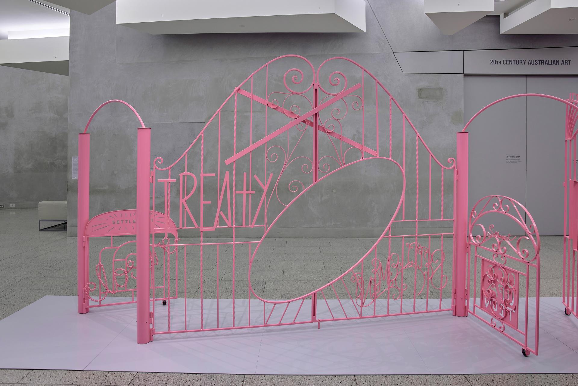 In an expansion of the artist’s broader, ongoing investigation into the domestic sphere as a site for understanding the human condition, Settlement and the gatekeepers, 2022, a major new commission by the NGV, is a set of recognisable domestic gates that the artist has modified. Each gate has been reworked to feature the most frequently used synonyms of the word ‘settlement’, a common word with many usages and meanings. Meanwhile, the same English-language thesauruses seldom list the word ‘treaty’ as a synonym for the word ‘settlement’, but the inverse is regularly true. Settlement and the gatekeepers brings attention to this omission and invites the viewer to think about how access is socially constructed through meaning. With each gate powder-coated and rendered functional in the gallery space, visitors are able to interact with the structures and the questions they elicit.
