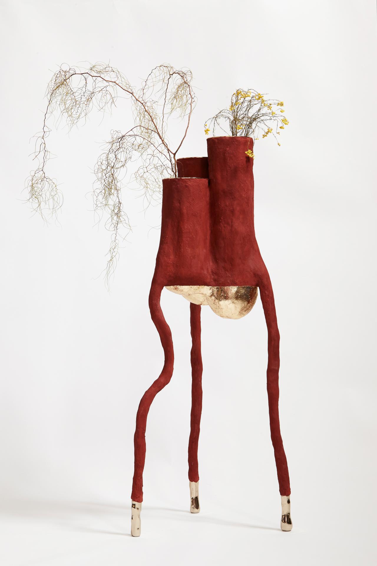 First shown as part of Melbourne Design Fair’s Select exhibition, Fleming’s Constellate vase, 2022, is emblematic of the artist’s distinctive style. This multi-tiered, clustered vessel is handmade from a mix of plaster, paper and pigment, constructed around a steel frame. The combination of rough-hewn surfaces and polished gold embellishments emphasises the work’s haptic qualities, thrumming with the free-form energy of the maker’s process. Where vases traditionally rely on secondary furniture for support, Constellate vase stands on its own asymmetrical legs, elevating the tripartite receptacles and the flowers they’re designed to hold. Each of Fleming’s handmade works is unique, with Constellate vase one of two limited-edition pieces. Anthropomorphic, theatrical and disarming, the vase encapsulates Fleming’s interest in imbuing household objects with emotion and encouraging personal connections with the viewer.