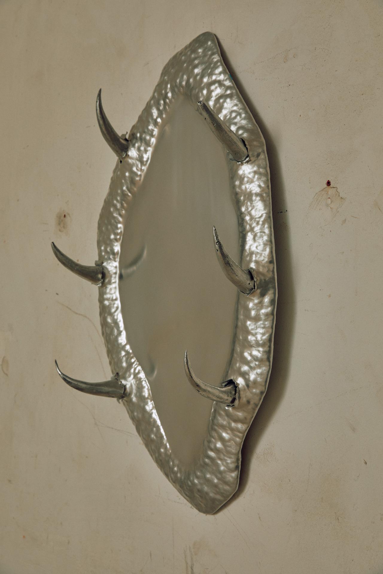 Introspection III, 2023, is a one-off collectable piece that reconfigures our notions of the domestic looking glass. The work is made entirely from aluminium, employing a variety of methods and processes to transform the medium’s qualities, textures and shapes. Introspection III’s frame is constructed from a hand-hammered aluminium sheet, from which emerge sand-cast aluminium thorns, with hand-polished aluminium used to create a somewhat reflective mirror. The piece depicts May’s own personal growth and evolution in a time and place where the world felt particularly vulnerable. For the artist, it is both a self-portrait and a representation of the queer community facing unclear visions of their future. The cragged exterior has been hand-beaten, its sharp thorns protruding from within, housing a mirror that offers a distorted reflection. May invites the viewer to observe themselves from another perspective, glimpsing the world as seen through the artist and their community’s eyes.