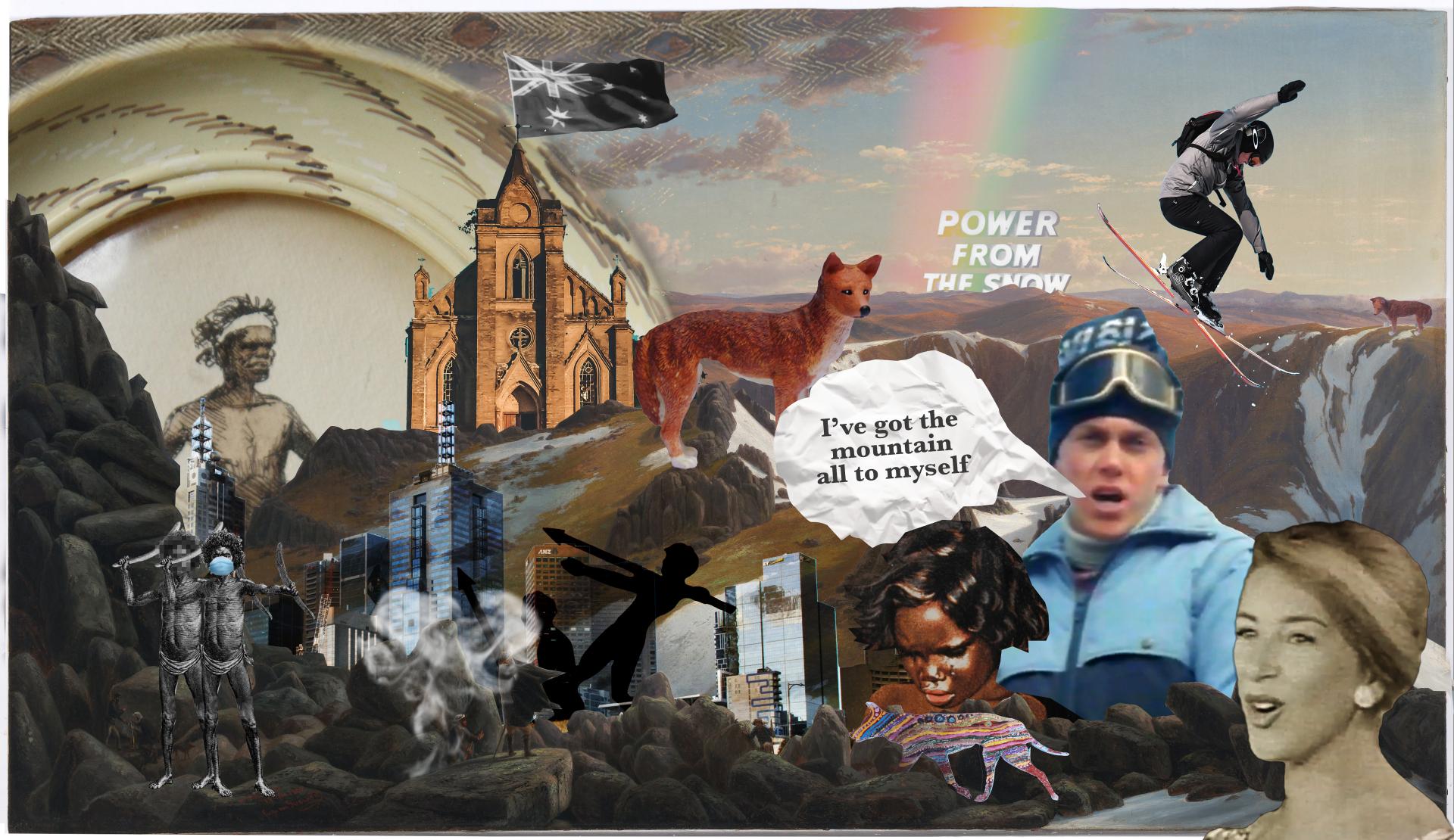 Paintings like this perpetuated the myth of terra nullius, and Peter’s work dismantles the legacy of erasure and misrepresentation by interrogating the way non-Indigenous people construct images of Aboriginal land and people. Through this searing yet playful contrast, he mocks non-Indigenous visions of Country that view it as something to be stolen, owned and exploited – nothing but ski slopes and untapped riches. As someone who views his Country from afar, Peter repurposes these fragmented images to piece together the multiple layers of his identity – proudly inserting them back into the landscape and proclaiming, ‘We are still here’.