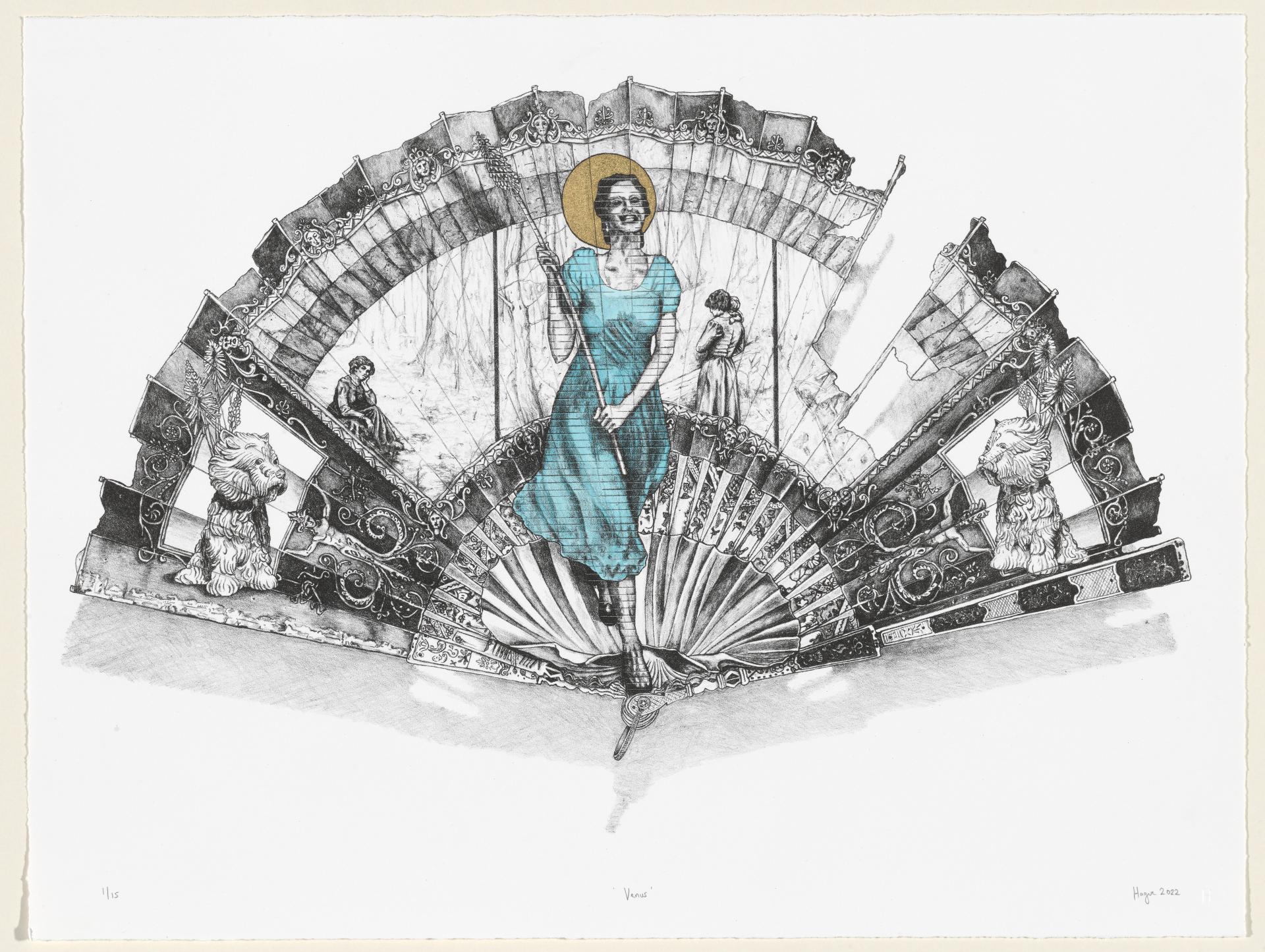 For Melbourne Now, Hague has created a lithograph of a fan decorated with images of objects from the NGV Collection. Expanding upon his ongoing series Porcelaine, which he began in 2012, Hague reimagines ubiquitous souvenirs, which he embellishes with appropriated imagery from various art-historical sources, such as colonial landscapes, to tell new stories. In this stone lithograph, he depicts a frayed fan decorated with elements from artworks in the NGV Collection, including female figures from Frederick McCubbin’s iconic painting The pioneer, 1904, and Jeff Koons’s Puppy, 1992, and arranges them around a modern-day Venus. This central figure is based on Pipilotti Rist’s video work Ever is over all,1997, in which the protagonist strikes the window of a parked car with a flower, causing it to shatter. Her behaviour stands in contrast to the quiet, stoic women in The pioneer, and the decorative elements that surround her. The damaged fan on which these elements are brought together alludes not only to fragility and the scars of history, but also suggests a kind of beauty that emerges from the remnants.