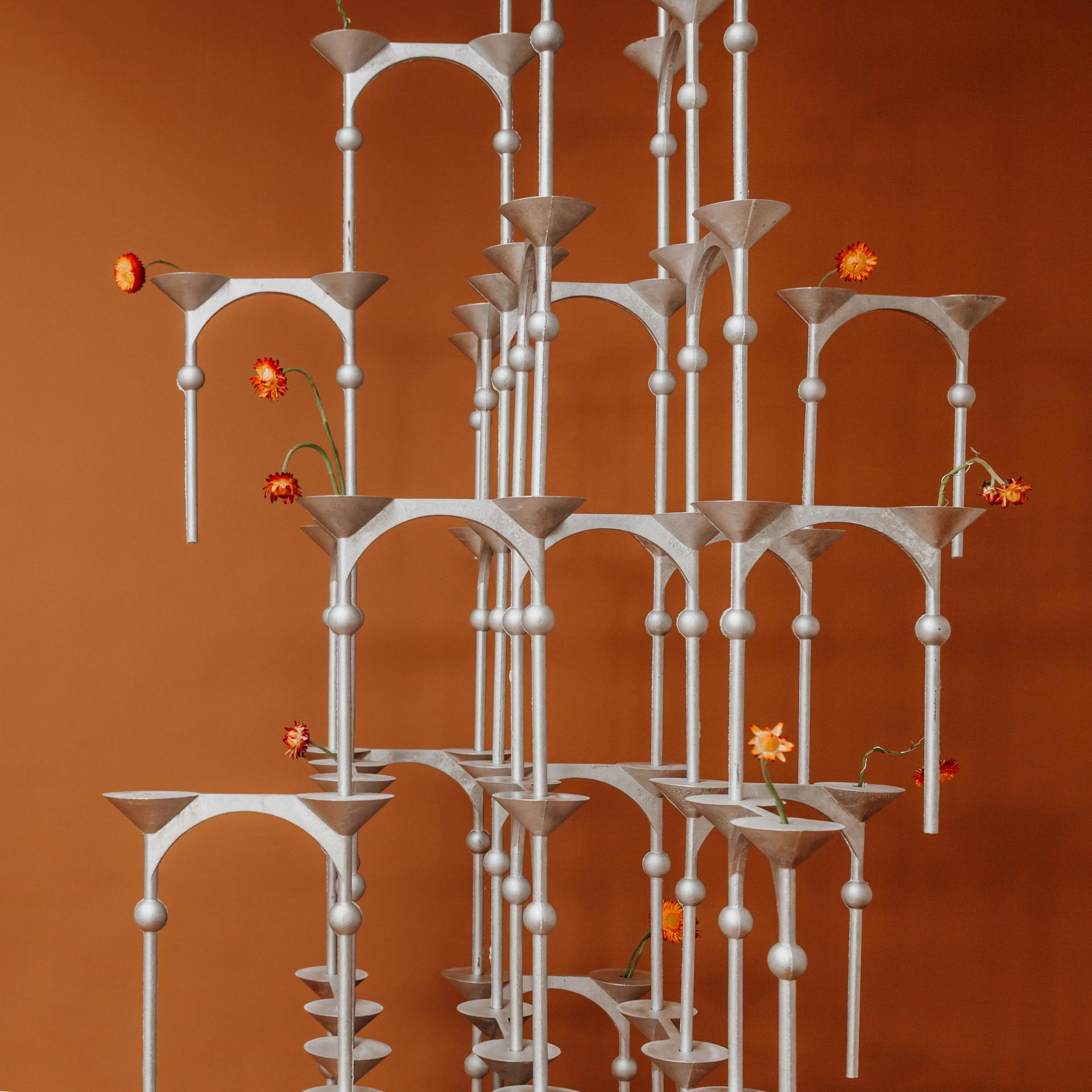 Like many of Ceravolo’s products, Entropy resists easy categorisation, taking a playful approach to function and semiotics. Created from raw cast aluminium, the intricate work reconfigures molecular structures into a surreal sequence of interconnecting parts, incorporating architectural shapes that gesture toward the designer’s own identity. Entropy’s use of negative space hints at loss, heartbreak and failure, but the complex structure is ultimately held together by repeating and entangled forms. Ceravolo sees it as a compressed timeline, showing the beauty and texture of shared human experiences.