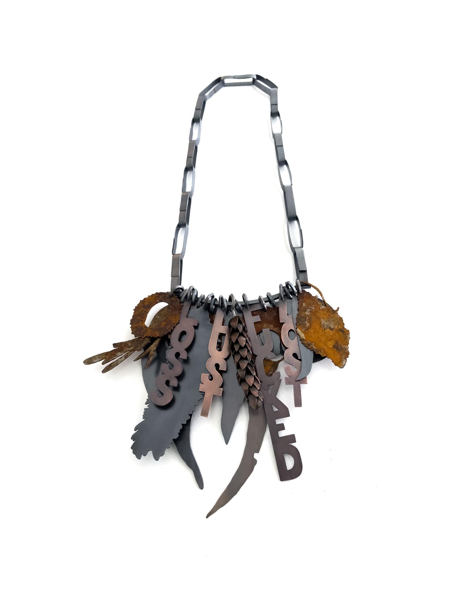 At Melbourne Now, Lüttin presents three new pieces expanding on her 2022 series Moment(o)s of Fragility, a collection of intricate jewellery works created in response to turbulent times. These wearable objects use beauty to counterbalance adverse global social, political and ecological events. The series conjures nature’s seasonal rhythms – repetition, growth, death, renewal – to invite deeper engagement and contemplation with its themes.