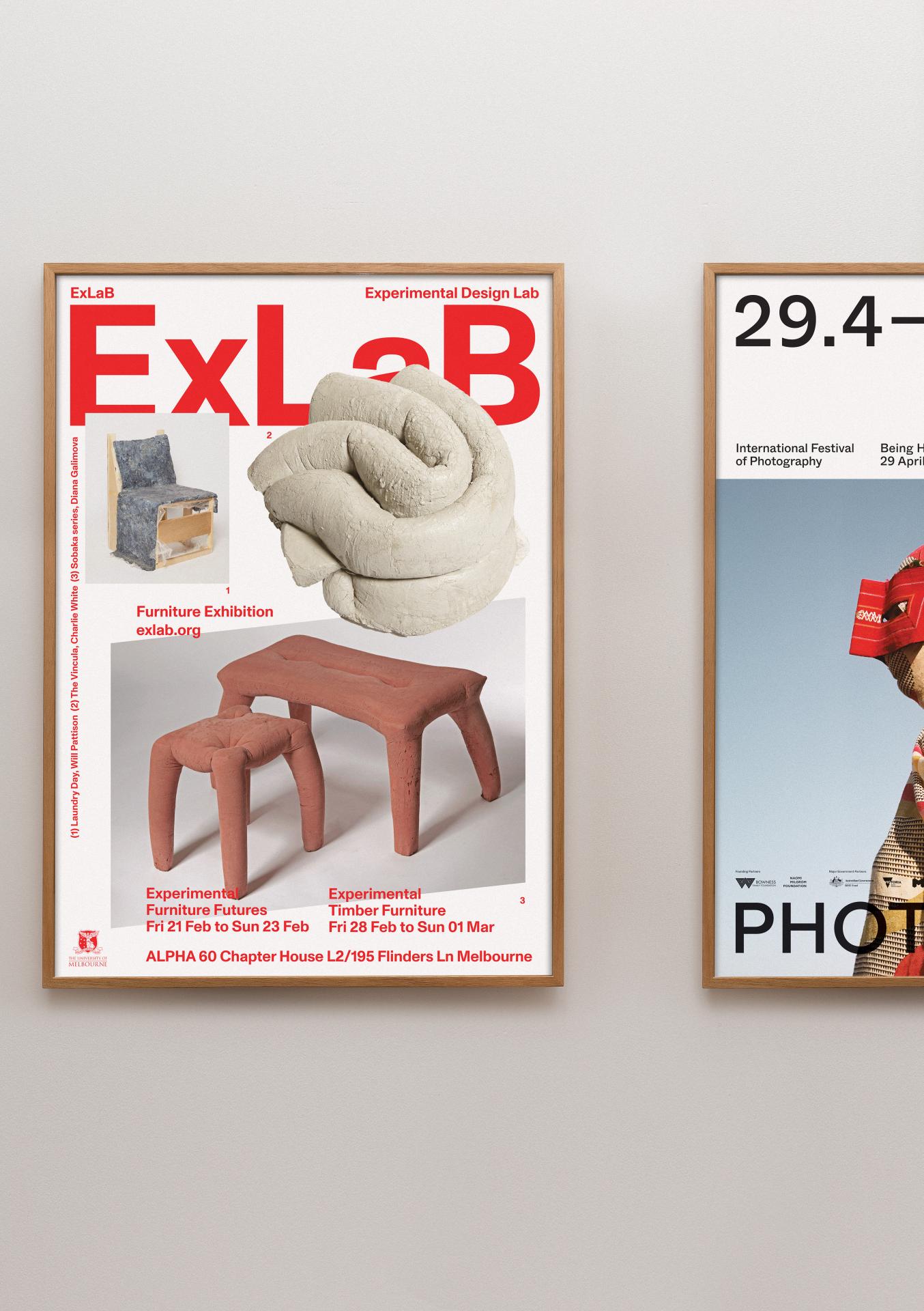 For Melbourne Now, U-P presents several posters representing various branding projects. The Experimental Design Lab is a studio at the University of Melbourne that investigates materials and process-driven design, for which U-P designed digital assets, posters, signage and a printed catalogue for end-of-year exhibitions. Landscape as Protagonist was a program curated by Molonglo that consisted of a day-long symposium and three public lectures. U-P designed the brand identity for the Landscape as Protagonist program, which was applied to posters, invitations, menus, environmental graphics and a website. The typography and format speaks to the idiosyncrasies and glorious imperfections of natural landscapes. PHOTO 2022 International Festival of Photography showcased work from over 120 global photographers in collaboration with over forty cultural institutions, museums, galleries and universities. U-P designed the brand identity for the festival across a spectrum of printed and digital applications.