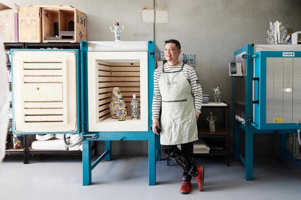 Vipoo Srivilasa is a Thai-born artist who has been based in Melbourne since 1997. Working predominantly with porcelain but also creating works on paper, mixed media sculptures, bronze statues and large-scale public art pieces, Srivilasa often incorporates food and interactive performance into his ceramic projects. His practice frequently explores cross-cultural and migration experiences, with a playful, contemporised blend of European historical figurines and Asian decorative art.
