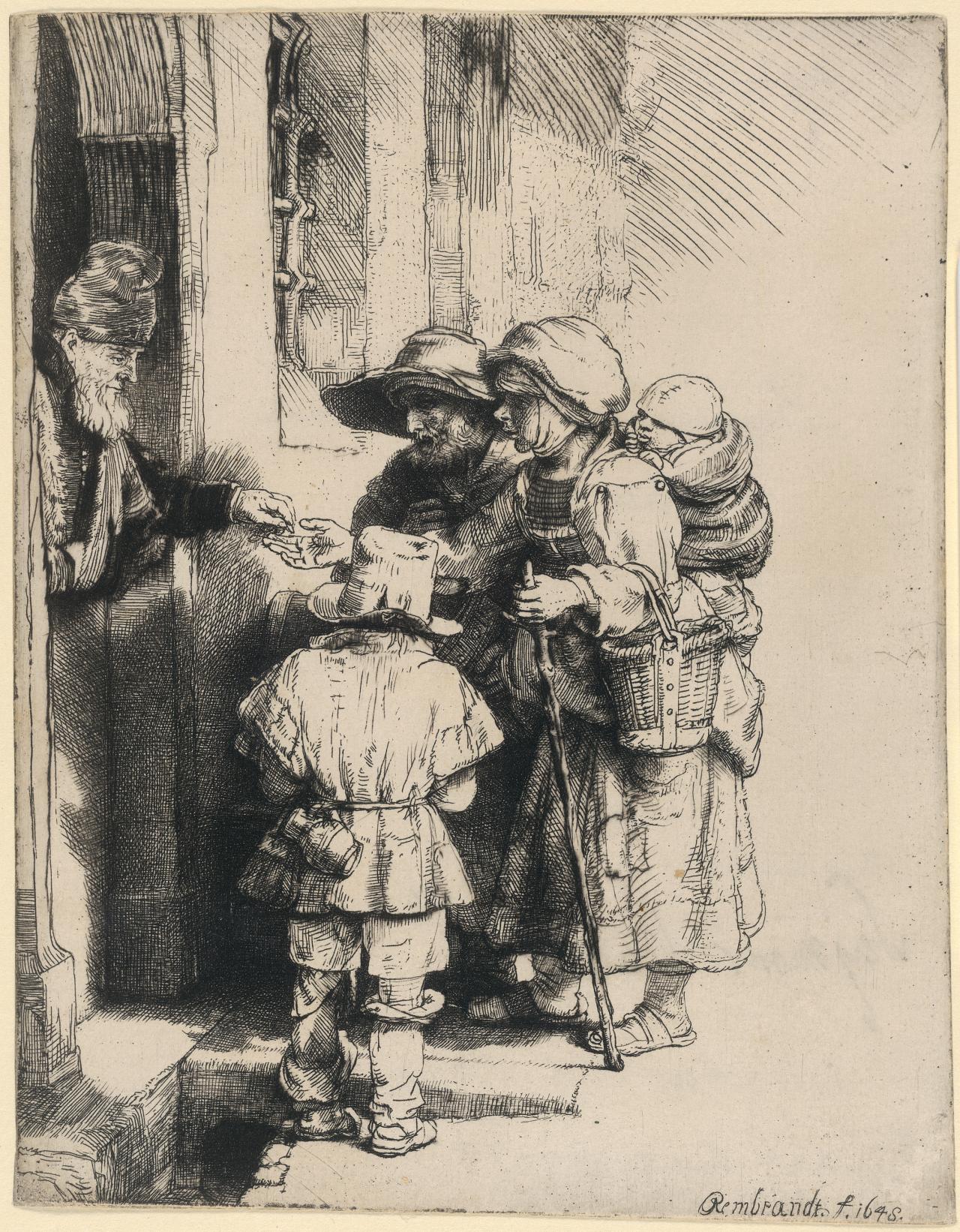 Petra Kayser: This print from 1648, also from the Fairfax collection, is one of Rembrandt’s images of beggars. The earliest of these were small-scale prints of solitary figures with a blank background. In this mature work Rembrandt developed the motif of the beggar into a genre scene. It is a complex composition in which all of the figures are linked in the moment when a man donates a coin to a family of beggars. The background on the right is blank, which gives prominence to the group of figures. In addition to the naturalistic detail, there is a symbolic element in the composition. The gutter at the bottom left and the door mark the division between the rich man in the house and the family on the right, but the entire composition is focused on the connection of the hands. The areas of light and dark around the hand of the almsgiver in the house draws attention to the act of charity that is the subject of this print.