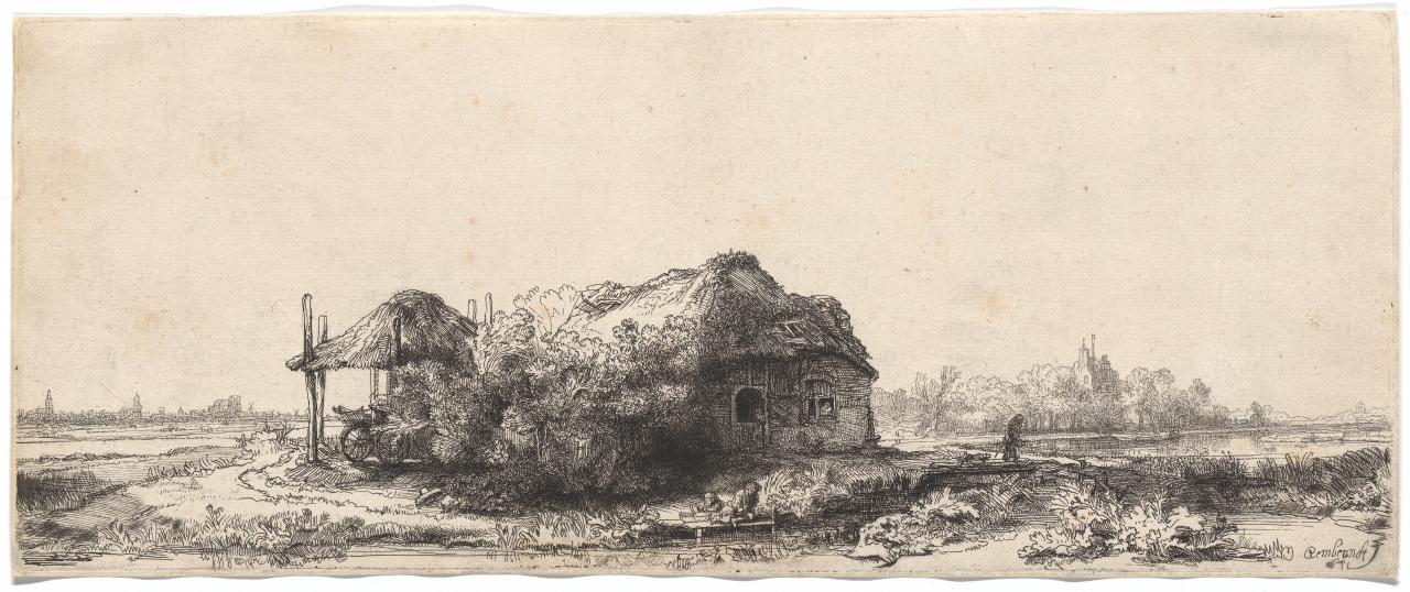 Cathy Leahy: Landscape with cottage and haybarn, 1641, is one of the landscape etchings in the group of seven prints by Rembrandt from the Fairfax collection. Landscape was a major subject in Rembrandt’s prints and drawings (although not in his paintings), and he produced landscapes at several different periods in his career. The first of his landscape etchings date from between 1641 and 1645 and this work is one of the earliest of that group. These etchings show the waterways and countryside around Amsterdam which we know Rembrandt walked extensively, observing particular locations and drawing on the spot. However, when it came to making his etchings, he moved things around to suit his own artistic ends and combined elements, producing composite views. This print is a wonderful example of that very practice. In the centre is a prominent and rustic farmhouse with a thatched roof topped with peat moss. There is a little cart nestled in beside the house, and the whole structure is set against a very low horizon. In the far distance on the left is a distant view of Amsterdam where we can see the city’s church spires, however on the right is a river scene with a house. Rembrandt often drew this particular manor house on the Amstel river; it appears in quite a lot of his drawings and prints. So, what we see here is how Rembrandt has combined these disparate elements to create the one composition.