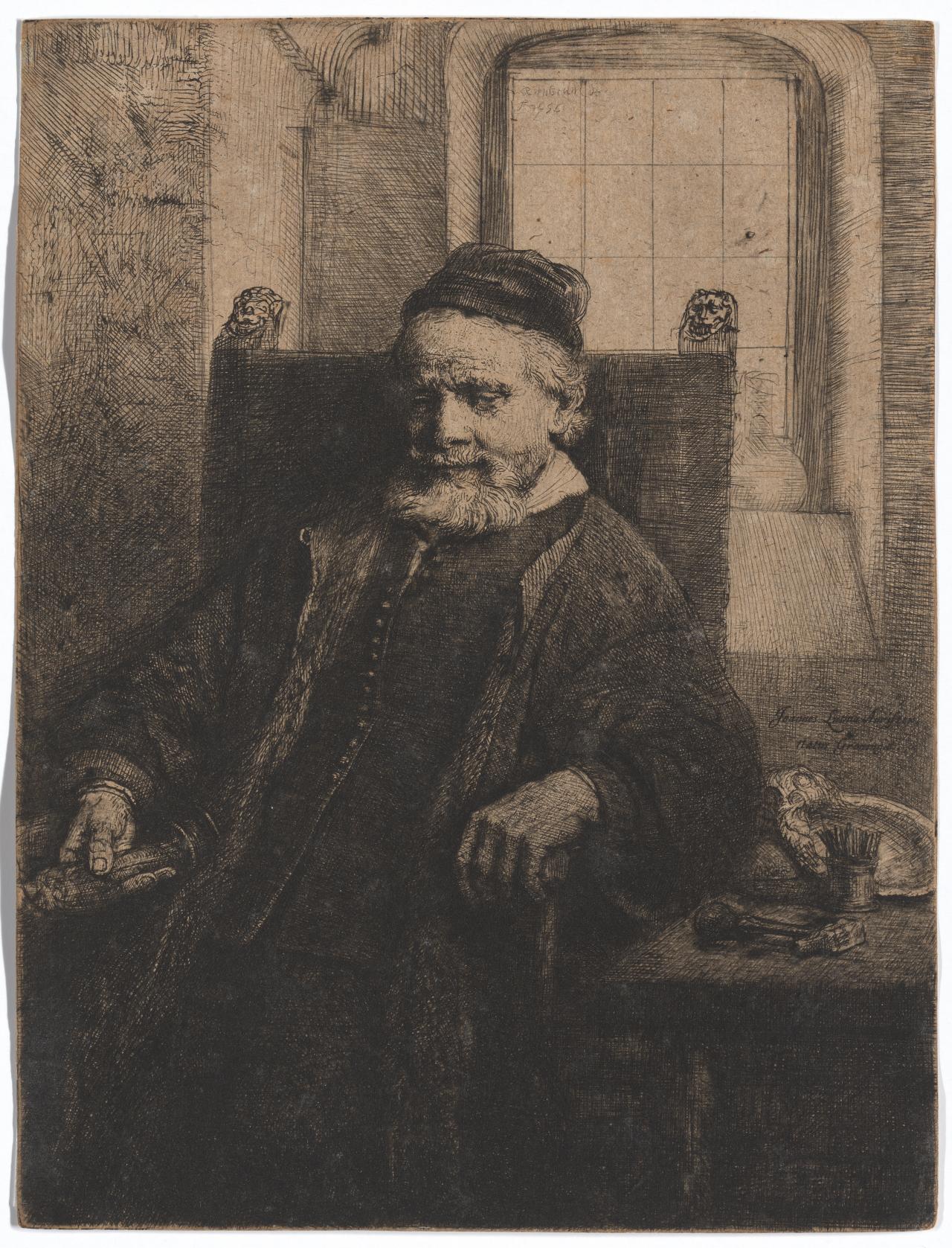 Cathy Leahy: This print, which has come to the NGV as part of the recent donation, is one of the group of great, late portraits that Rembrandt made of friends or close contacts between 1655 and 1658. Jan Lutma, who is the subject of this print, was a famous gold and silver smith in Amsterdam. He is shown here with the tools of his profession; a figure he has made in his hand, and a hammer and gold working tools on the table on the right. In these late portrait prints, Rembrandt set his sitters in interiors in which there is an extraordinary play of light and shade that is emphasised by the heavy inking and selective wiping of the plate. And Rembrandt also varied these effects through his use of different types of paper; here the heavy oatmeal paper adds real warmth to the print. We also see an enigmatic half smile on the goldsmith’s face. This is typical of Rembrandt’s late portraits, which have a very strong focus on the psychological presence of the sitters. This print was made in 1656 around the time Rembrandt succumbed to bankruptcy. It has been suggested in the literature that Rembrandt would turn to portraiture commissions at times of financial hardship.