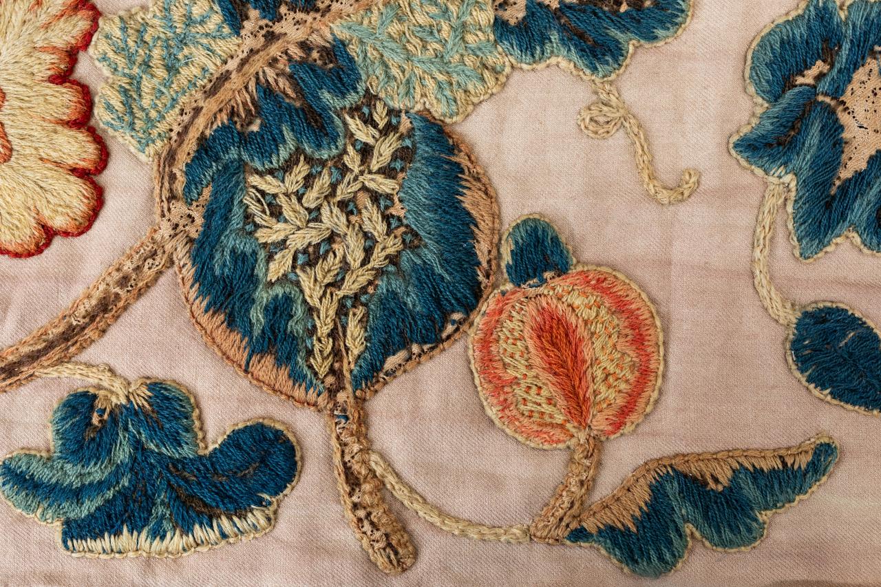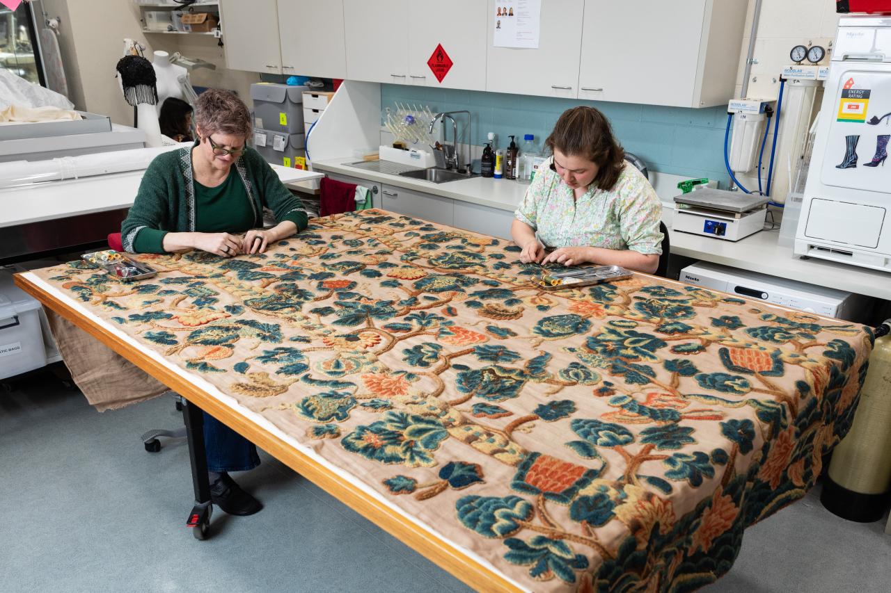 The NGV Conservation department recently completed a major conservation treatment on the first of a pair of seventeenth-century Crewelwork bed curtains, generously donated to the NGV in 2018 by the Murdoch Foundation. Crewelwork uses two-ply worsted wool to embroider a dazzling variety of stitches on a typically linen ground. Like many historic crewelwork bedhangings, the two curtains were re-purposed to allow their continued use. These curtains hung for many decades as window furnishings in the late Dame Elisabeth Murdoch’s sitting room at Cruden Farm in Langwarrin in Melbourne’s south-east.