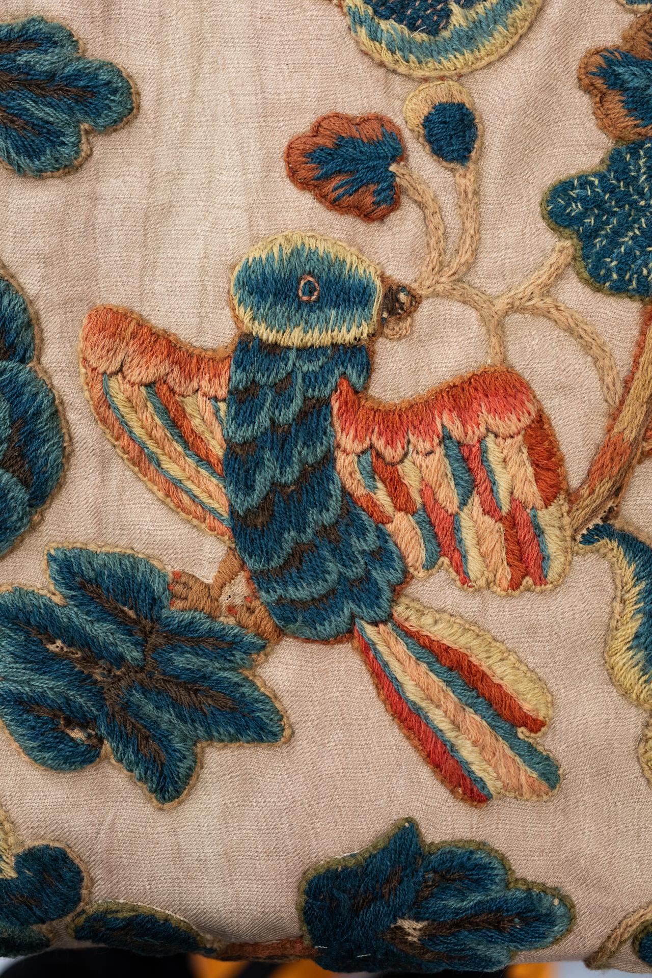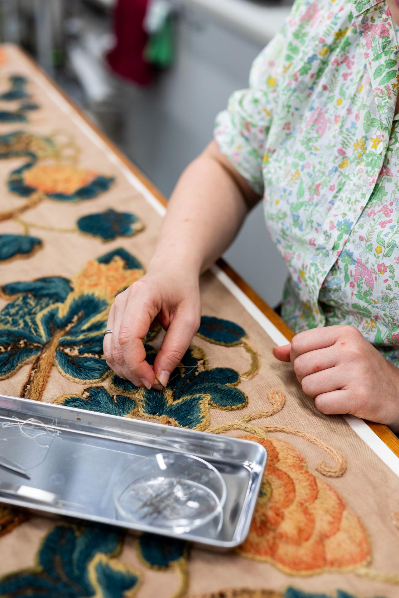 Due to their long life as practical items, the curtains required significant treatment before they could be displayed to the public. The first curtain came into the NGV Collection with its wool embroidery intact but completely detached from its deteriorated linen backing. Conservation treatment involved stabilisation and securing the many crewelwork elements onto a new ground of historically accurate twill linen. This work was carried out by various members of the NGV Textiles Conservation team. The first panel has been transformed from a lattice of unsecured embroidery into a complete curtain, which can now be displayed hanging on a wall. The thick wool embroidery, which kept its owners comfortable as they slept in a four-poster bed almost 400 years ago, is still incredibly robust.