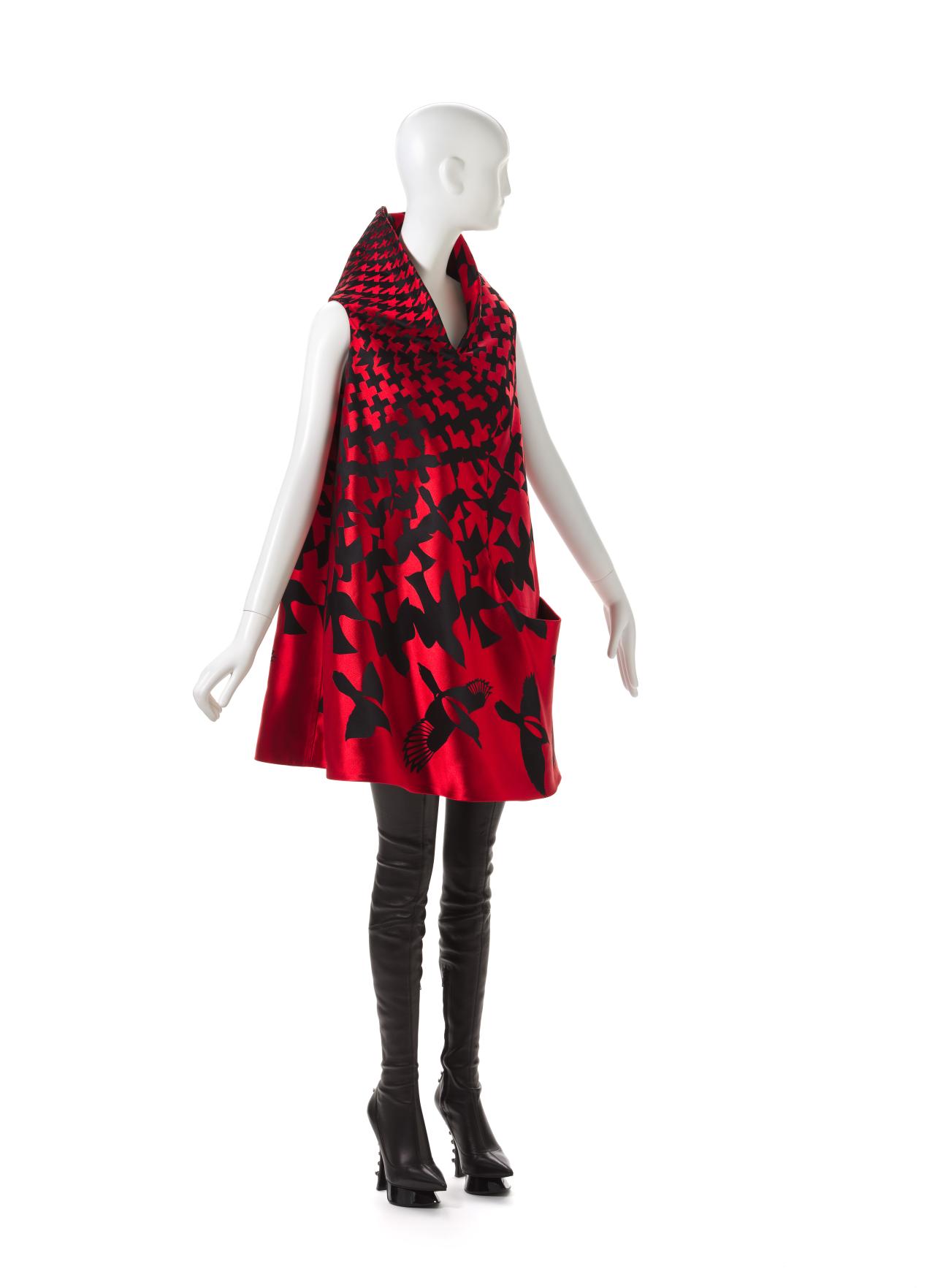 Artwork number 5: Alexander McQueen, London (fashion house), Alexander McQueen (designer), Look 29, dress and boots 2009 {Horn of Plenty collection, autumn-winter 2009-2010}, silk, acetate, leather, polyster, vinyl, metal (zip and studs) (a) 104.0 cm (centre back) 59.0 cm (waist flat) (dress) (b-c) 84.0 x 9.0 x 26.0 cm National Gallery of Victoria, Melbourne, © Alexander McQueen