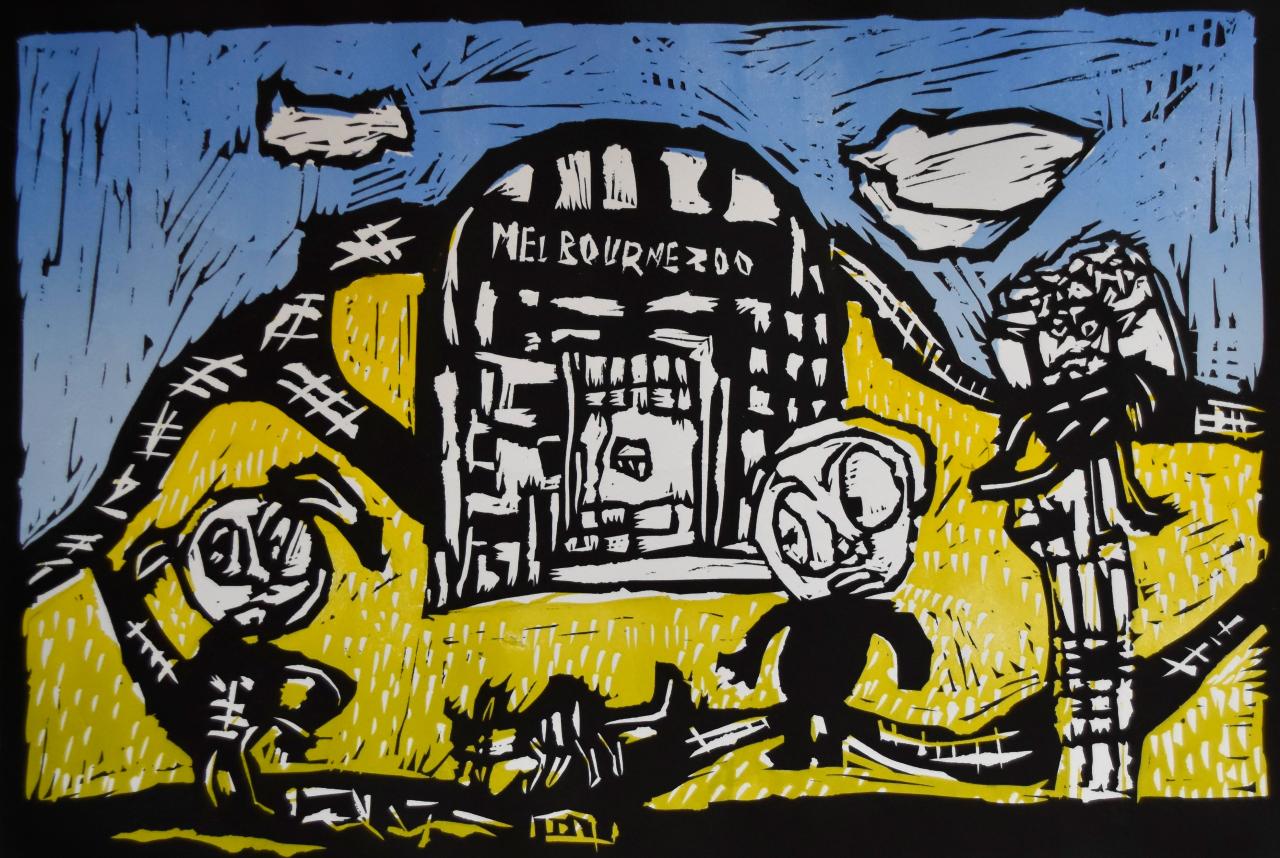 Artwork number 2: Matthew Clarke Lost in Melbourne Zoo 2022; colour linocut; ed. 1/15. Commissioned by the National Gallery of Victoria, Melbourne, 2022. © Matthew Clarke. Printed by Glenn Morgan.