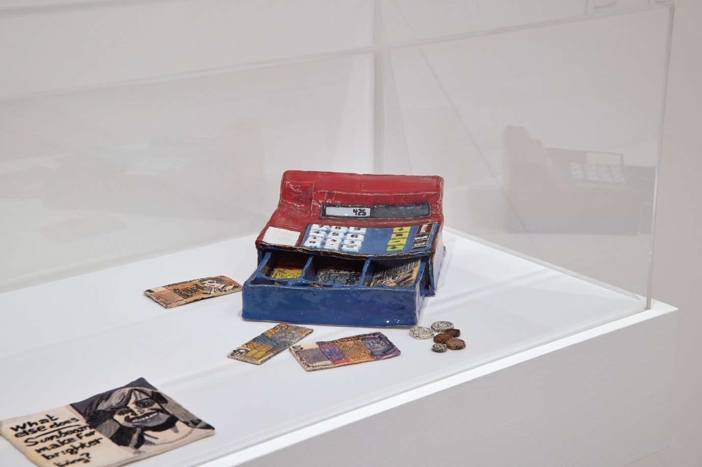 Artwork number 1: Installation view of Lisa Reid’s The old fashioned cash register with the old paper dollar notes and coins, 2018 on display as part of the Melbourne Now exhibition at The Ian Potter Centre: NGV Australia, Melbourne from 24 March – 20 August 2023. Image: Sean Fennessy