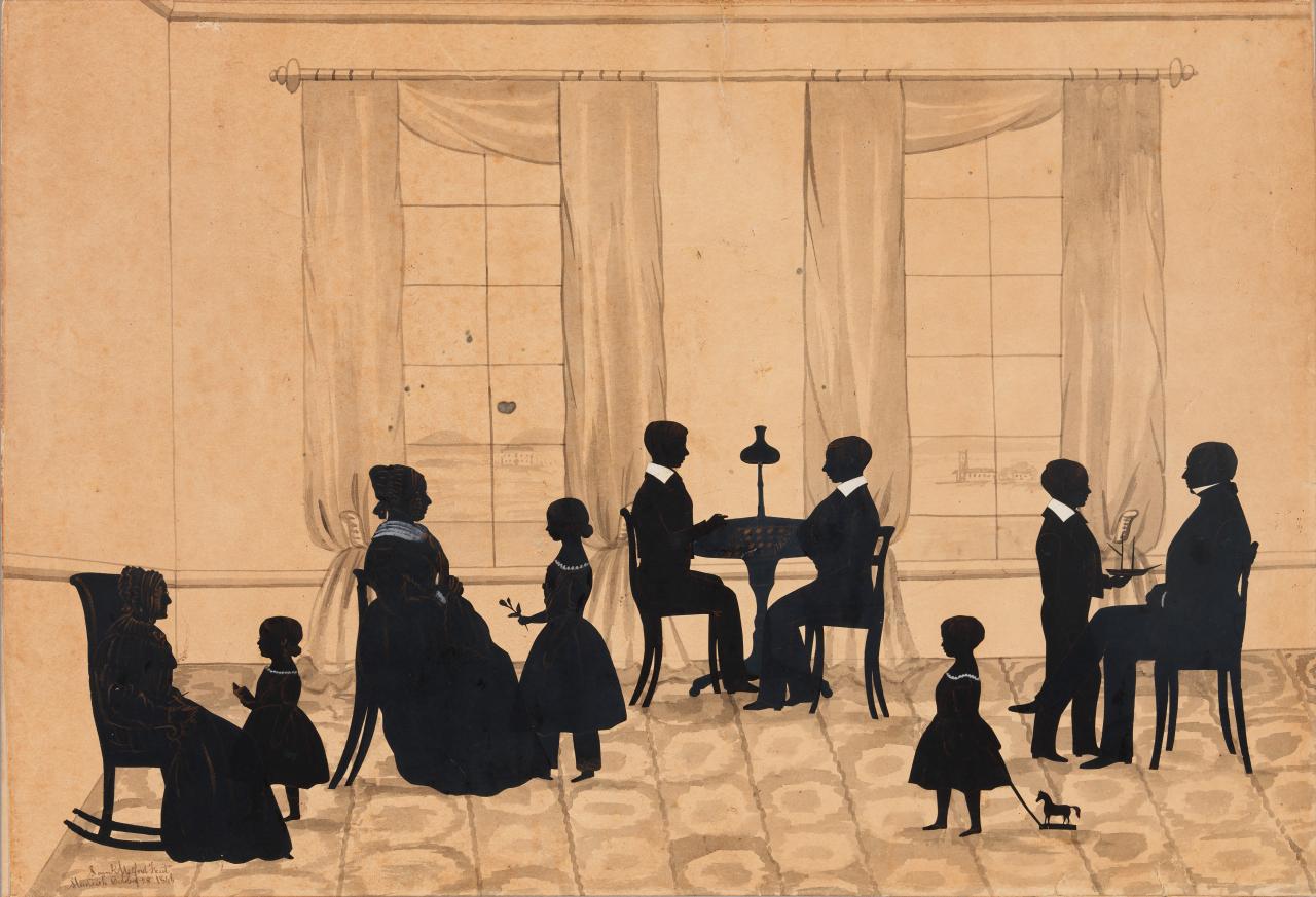 Artwork number 5 Samuel Metford, England 1810–90, lived in United States 1834–44 Mackenzie family silhouette 1846, brush and ink, pen and ink, stencil cut-out with watercolour highlights 43.2 cm x 64.0 cm. National Portrait Gallery, Canberra, Gift of the Estate of Nancy Wiseman 2007