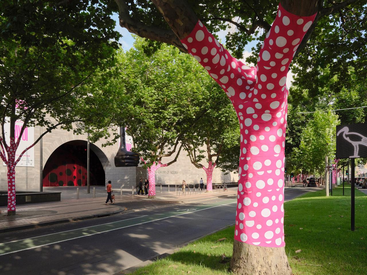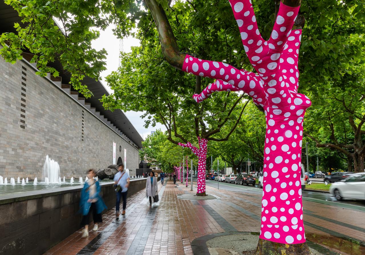 Along St Kilda Road, outside NGV International, the tree trunks are wrapped in fabric that is pink with white dots.