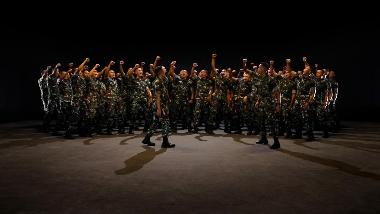 Collaborating with the Garuda Merah troops from the Yogyakarta Infantry Battalion 403, the work showcases a slowed-down choreography set to the song Terpesona, combining an erotic yet intimidating energy that subverts the effects of a war cry.